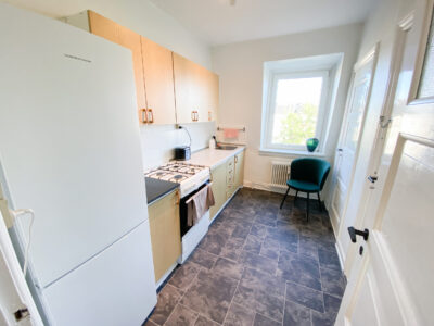 Videre ind i lejligheden kommer du til det hyggelige køkken, som har et karakteristisk sort gulv og flotte træelementer i form af køkkenlåger og skuffer. Den modsatte væg står bar, hvilket giver mulighed for at tilføje personlige detaljer som et rullebord med krydderier, olier eller andre køkkenredskaber – her er plads til kreativitet og personlig indretning. Der er også et lille indbygget skab til eksempelvis rengøringsartikler.