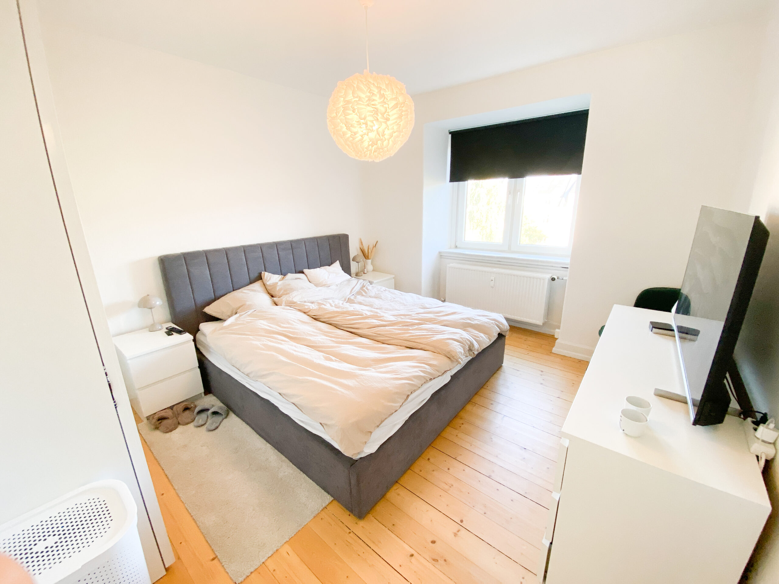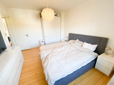 Soveværelset er rummeligt og indrettet, så der er god plads til en stor seng centralt i rummet. Her er også plads til et stort klædeskab og andet nødvendigt møblement. Det store vindue sikrer et skønt naturligt lysindfald, som gør rummet lyst og behageligt.