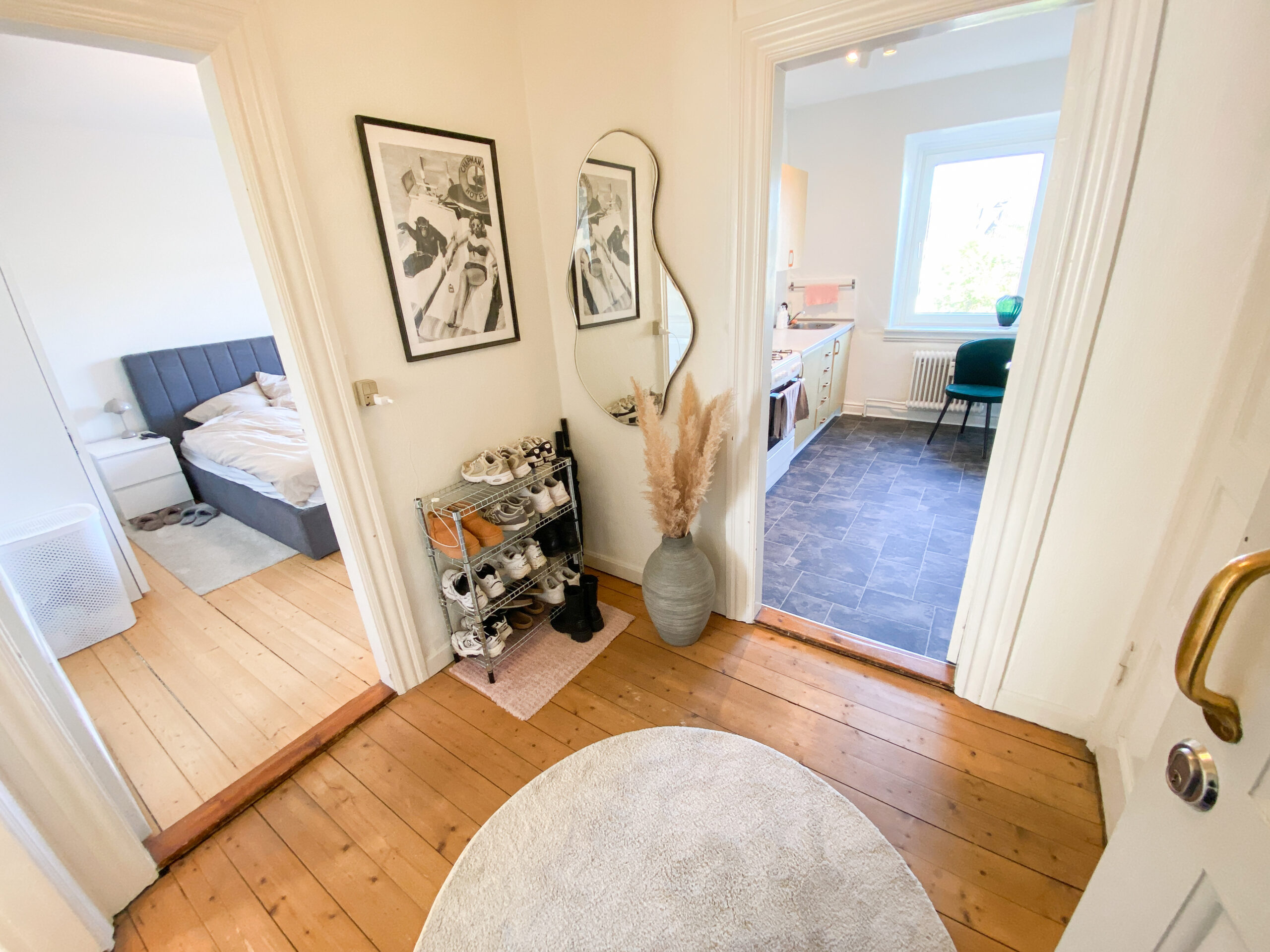 Alt i alt en lys og rummelig lejlighed, der tilbyder masser af plads og muligheder for en både funktionel og hyggelig indretning. Man kan ikke kigge ind i lejligheden, hvilket også giver noget privatliv.