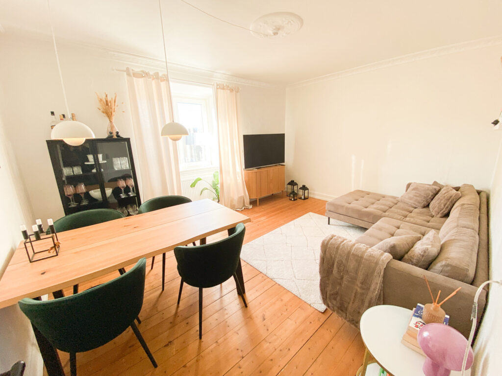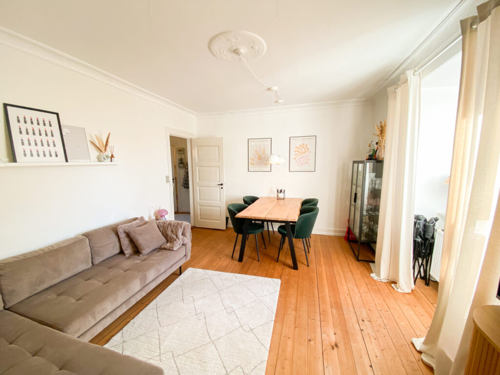 Til sidst kommer vi til stuen, hvor der strømmer sollys ind i løbet af dagen. Stuen er rummelig nok til både at indrette et spisebordsområde og en hyggelig tv-stue, begge i fuld størrelse uden at det føles trangt. Her er der rig mulighed for at skabe din egen personlige atmosfære og få det bedste ud af lejlighedens indbydende rammer.