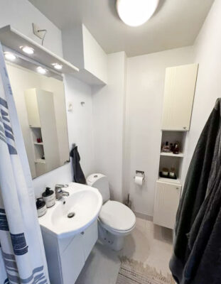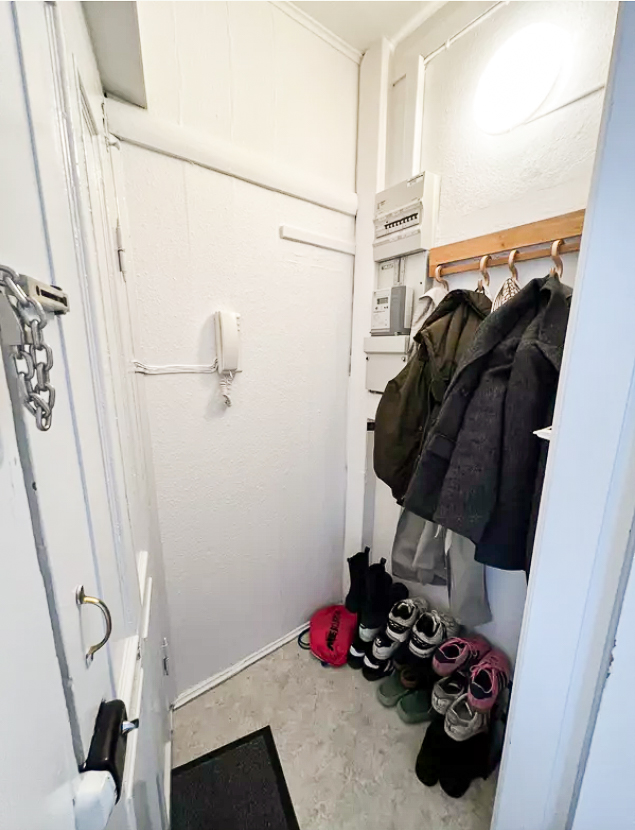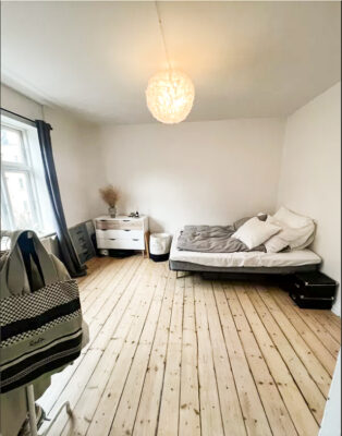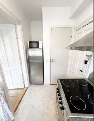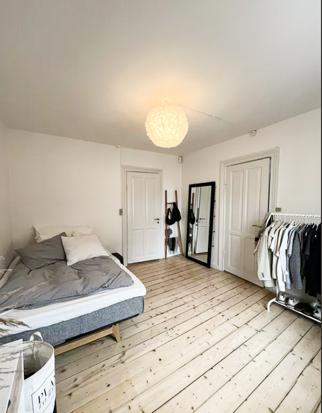 Ved indgangen mødes du af en lille entré, som er praktisk indrettet med plads til overtøj og sko. Herfra træder du ind i en lys og indbydende stue, der sammen med soveværelset har smukke trægulve, der tilfører en varm og naturlig atmosfære. Stuen er perfekt til afslapning og socialt samvær, mens soveværelset tilbyder ro og komfort til nattetimerne.