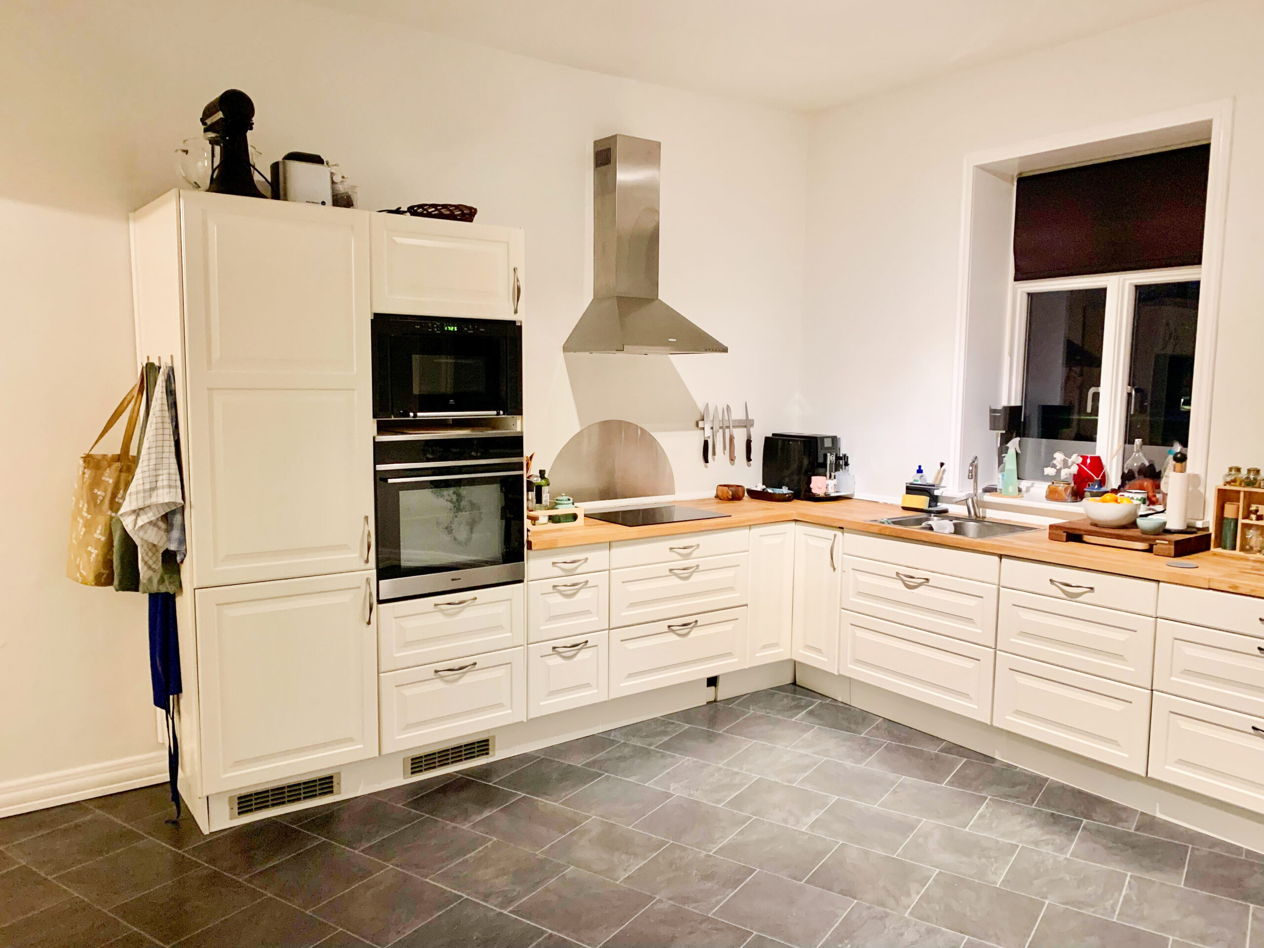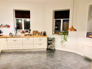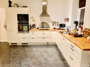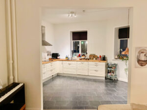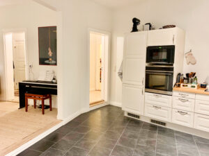 Køkkenet er en perle med sin imponerende detaljerede låger og smukke træoverflader, og der er en opvaskemaskine. Det tilbyder rigelig plads og et velholdt gulv, der skaber en tiltalende atmosfære til madlavning og samvær.