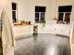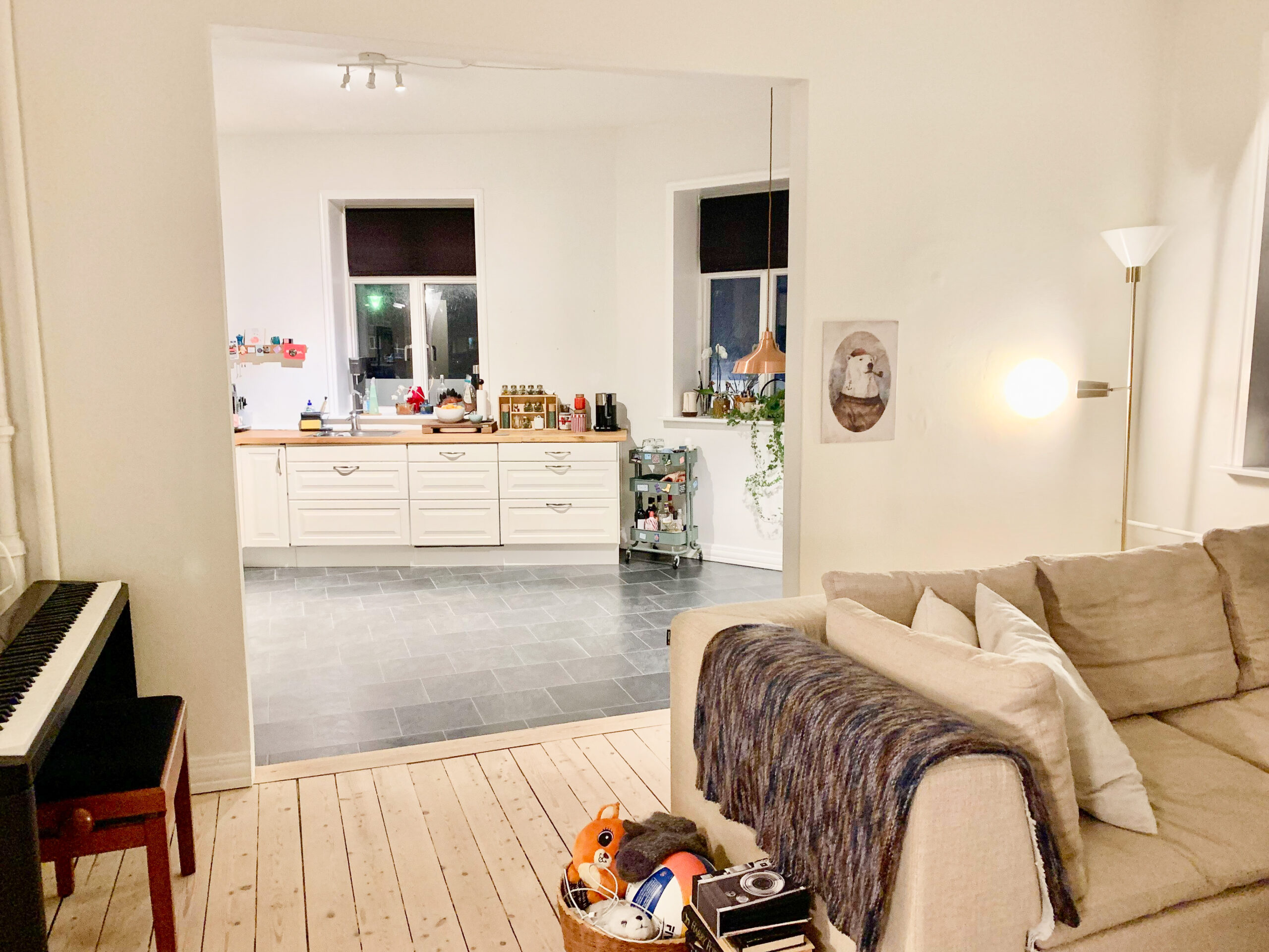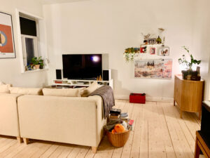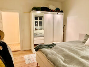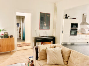 Lejlighedens layout præsenterer to åbne rum, hvoraf det ene udgør stuen og det andet køkkenet. Denne smarte indretning skaber en fornemmelse af fire separate værelser, da spisebordet naturligt kan placeres i køkkenet, hvilket frigør hele stuen til sofahjørne og andre bekvemmeligheder.