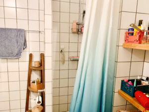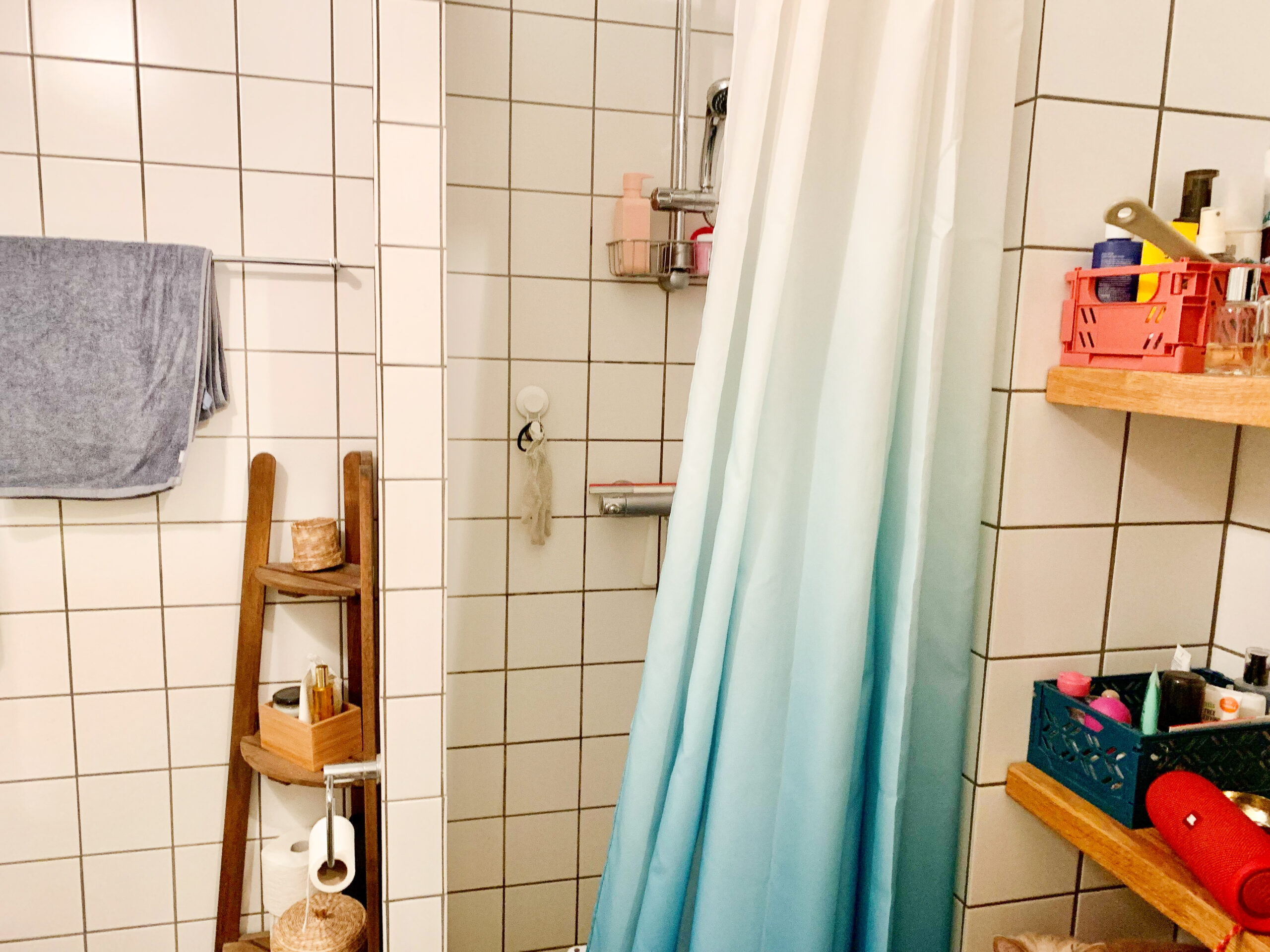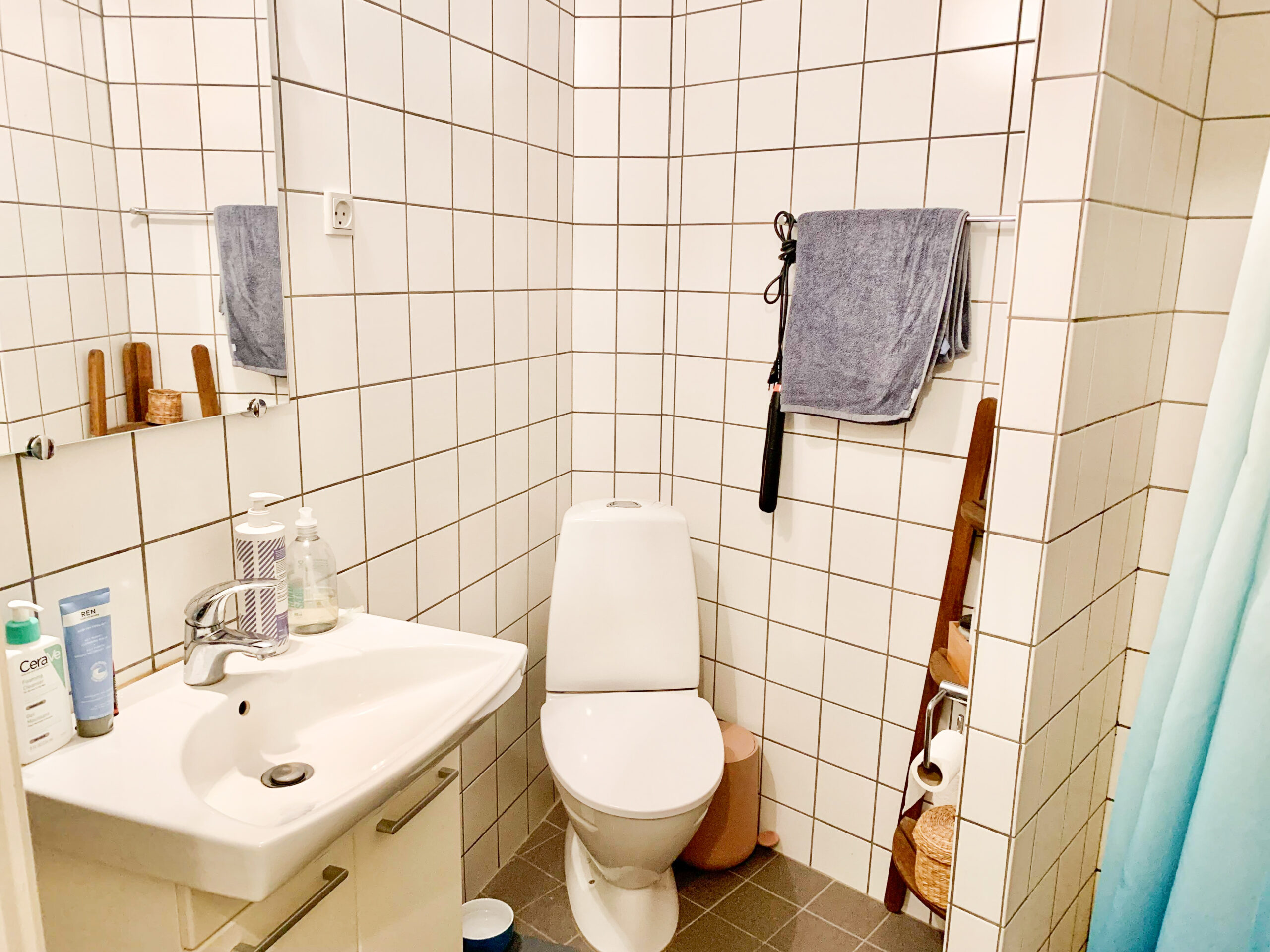 Badeværelset er elegant udført med hvide klinker og tilbyder ekstra opbevaringsplads samt en smukt indbygget bruseniche, der tilføjer funktionalitet og stil til rummet.