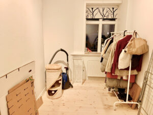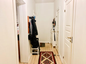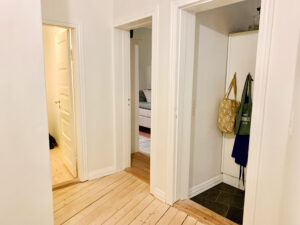 Denne charmerende lejlighed byder velkommen gennem en praktisk entré, der åbner op til en fordelingsgang med et praktisk opbevaringsrum, ideelt til installation af en vaskemaskine og tørretumbler, hvilket gør håndteringen af daglige opgaver bekvemt og effektivt. Nuværende lejers maskiner kan købes.