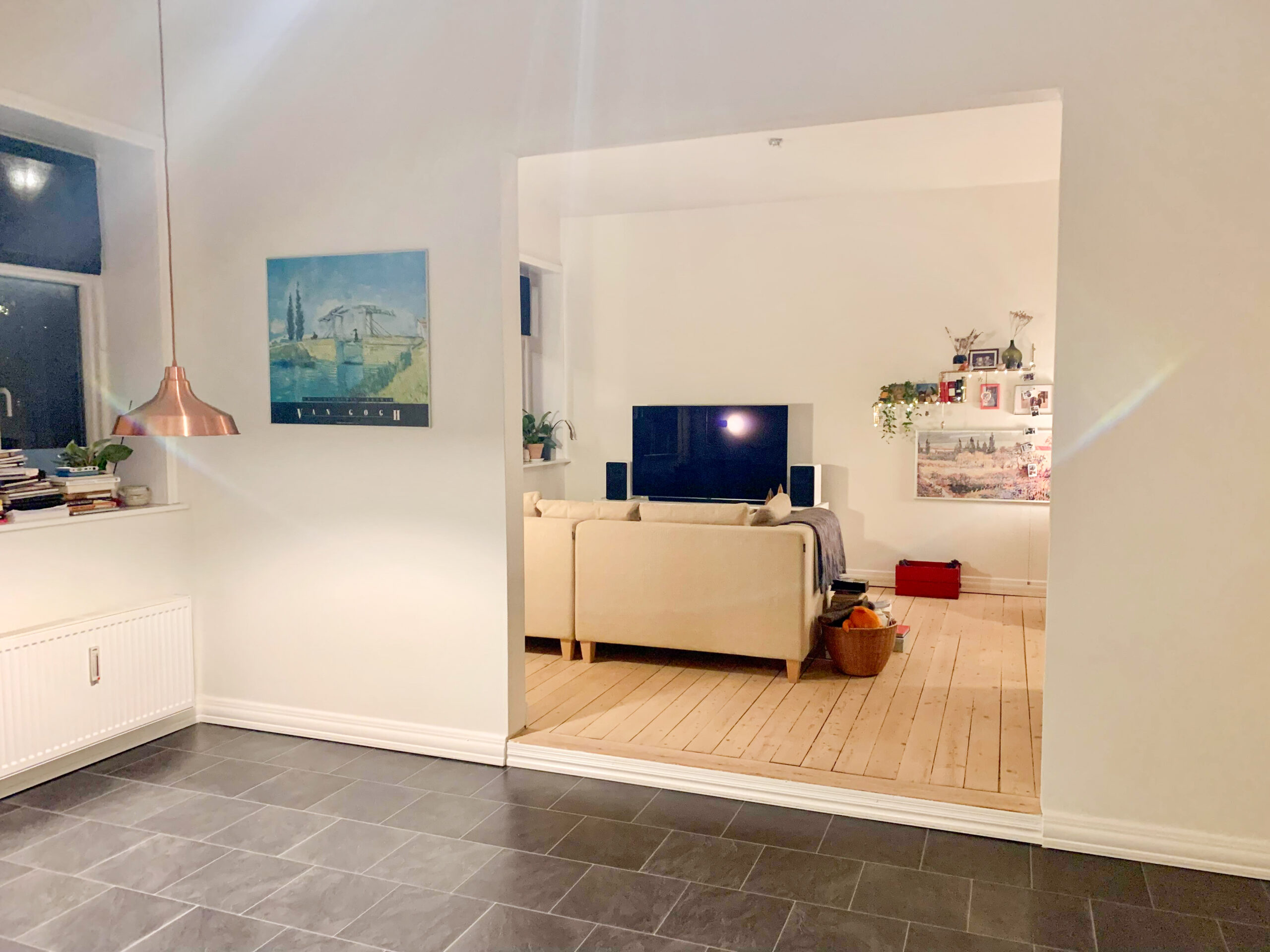 Lys strømmer ind i hele lejligheden, da den ligger i hjørnet af bygningen. Beliggende på stueplan, men hævet fra gaden, tilbyder den privatliv og samtidig et godt lysindfald uden at kompromittere integriteten.