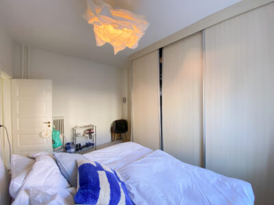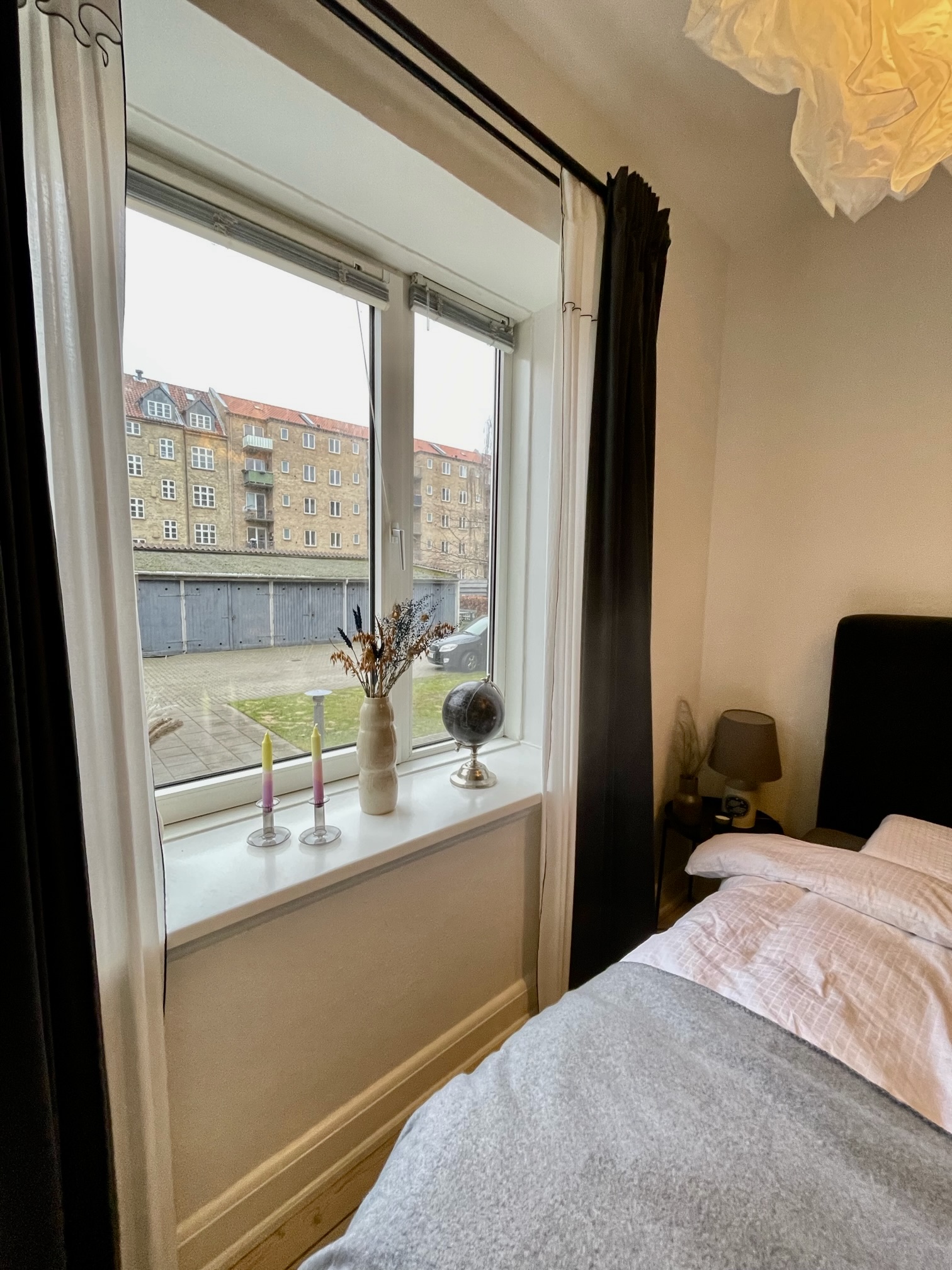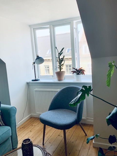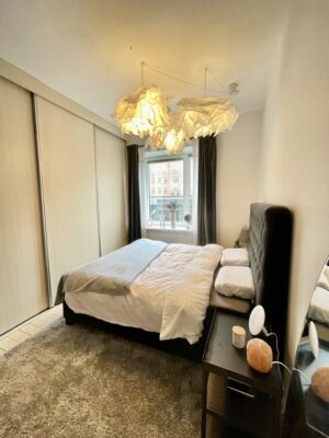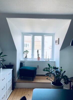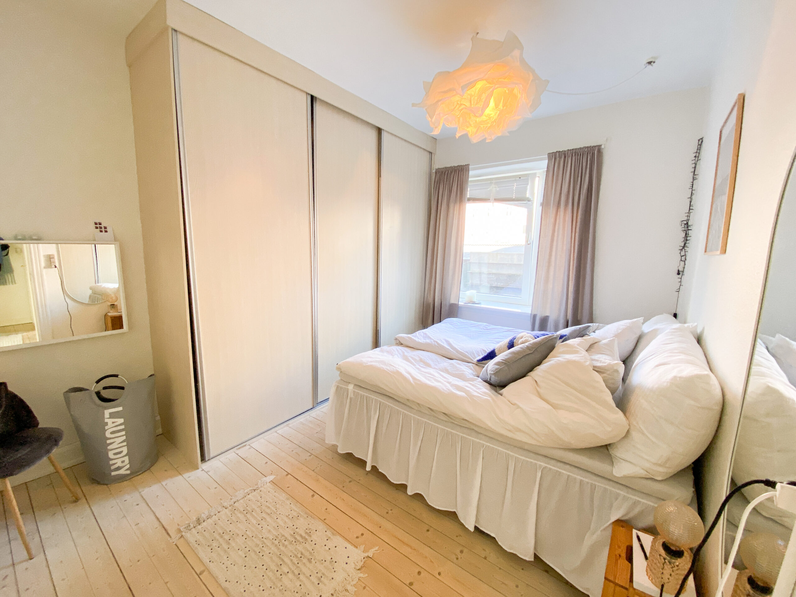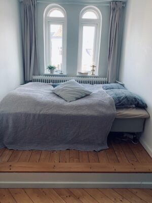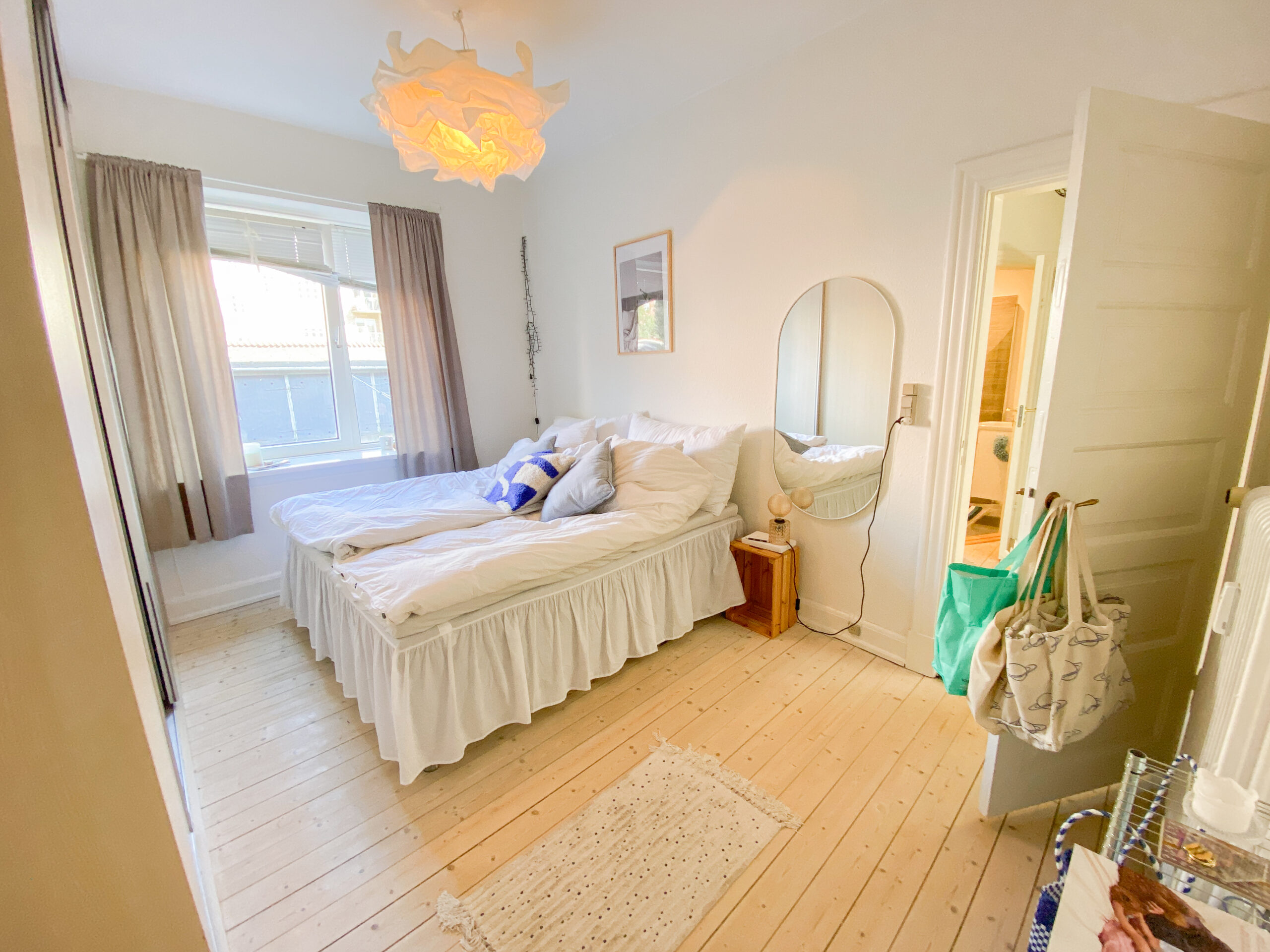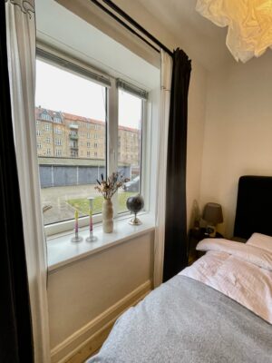 Herefter har vi soveværelset. Det er et godt rum med plads til både en stor seng, et stort klædeskab og et kontorområde. Det er meget dejligt med plads i en 2-værelses lejlighed, og det har denne samt hygge og lys.