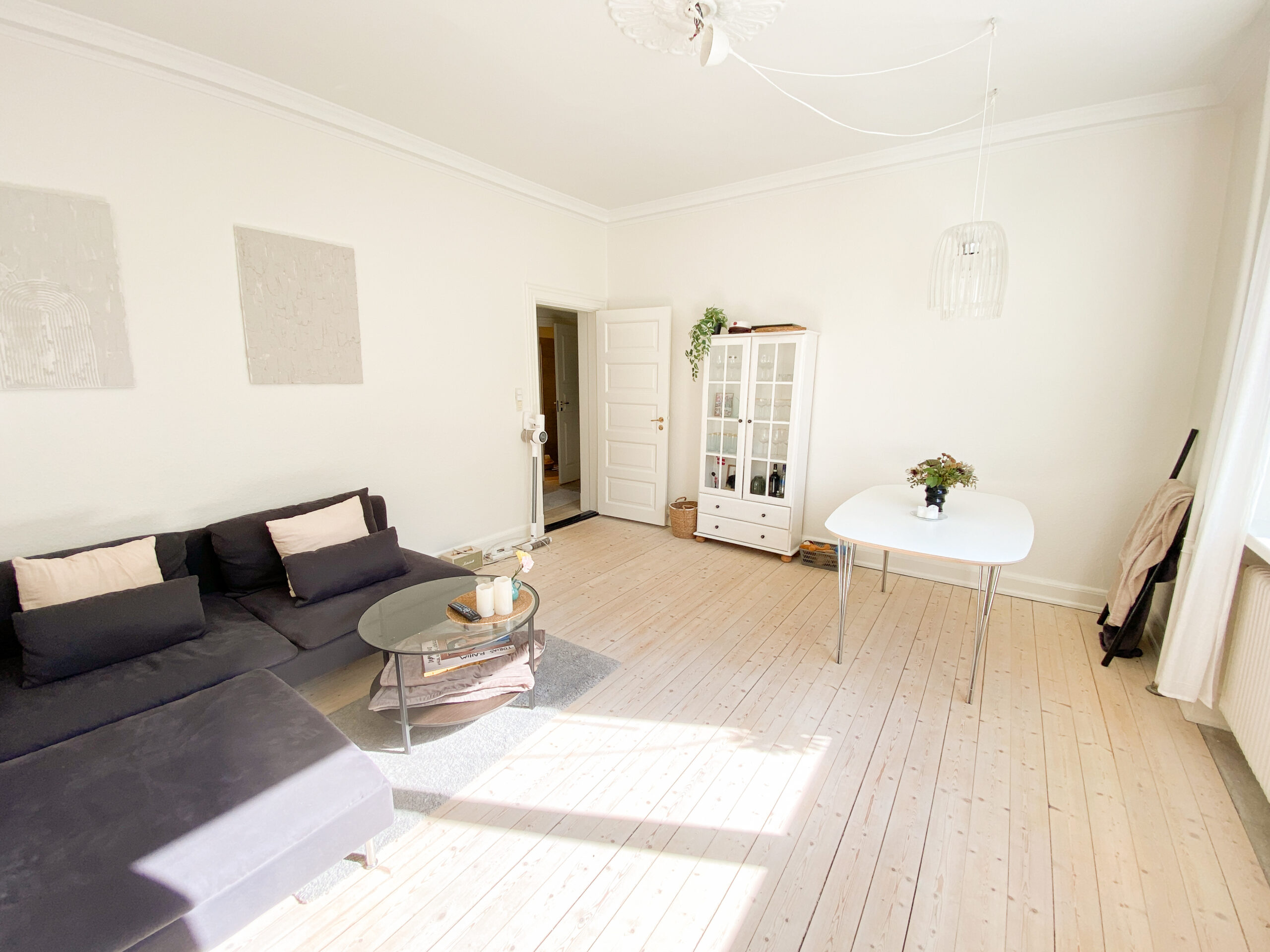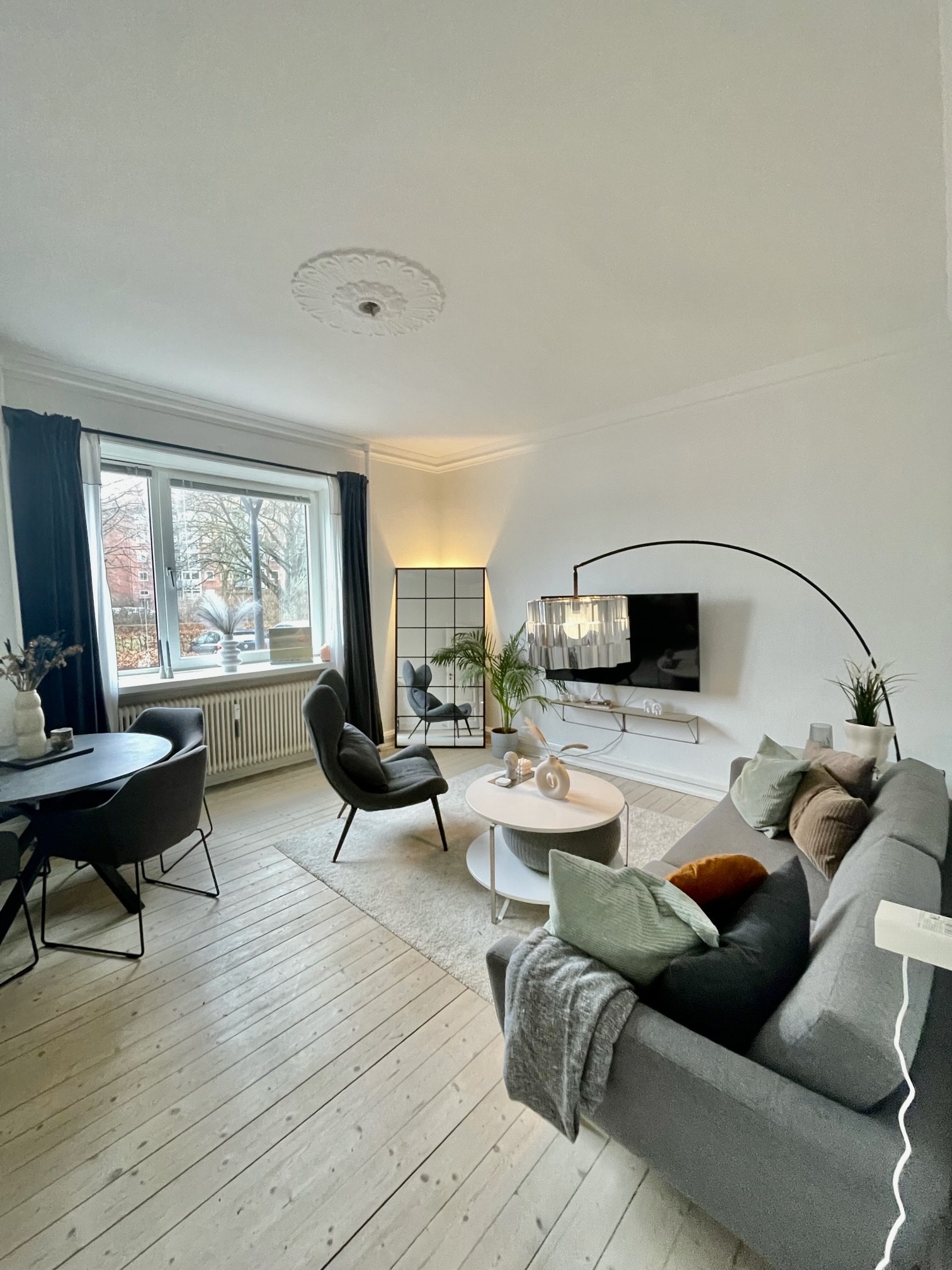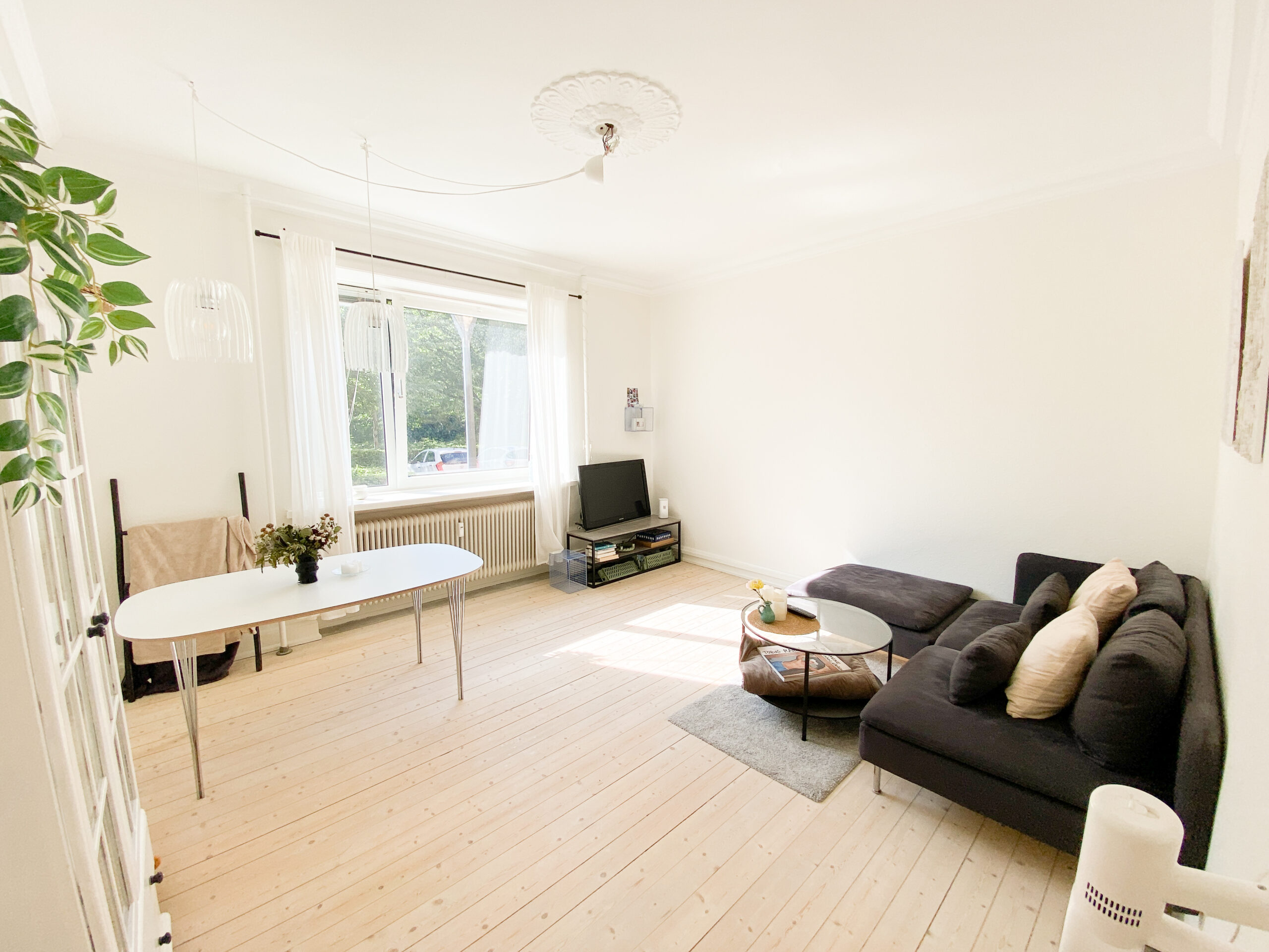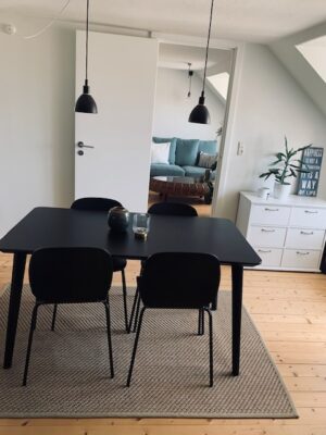 Til slut har vi stuen. Der er flere forskellige muligheder for indretning, der er et godt eksempel på billedet med et rundt spisebord, som giver plads til mange på lidt plads. Her strømmer lyset også ind fra det store dejlige vindue.