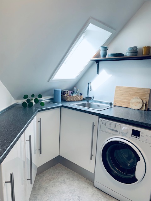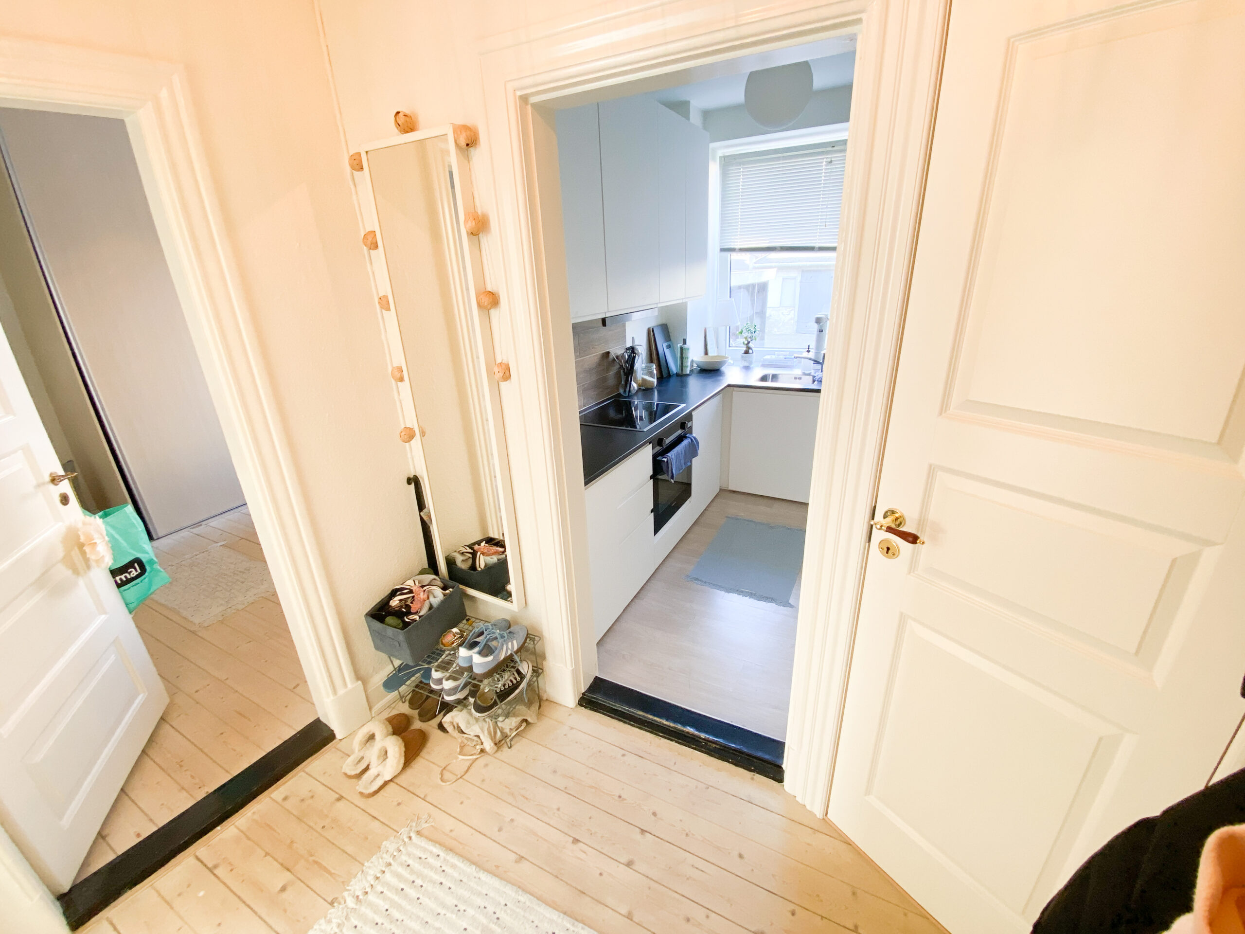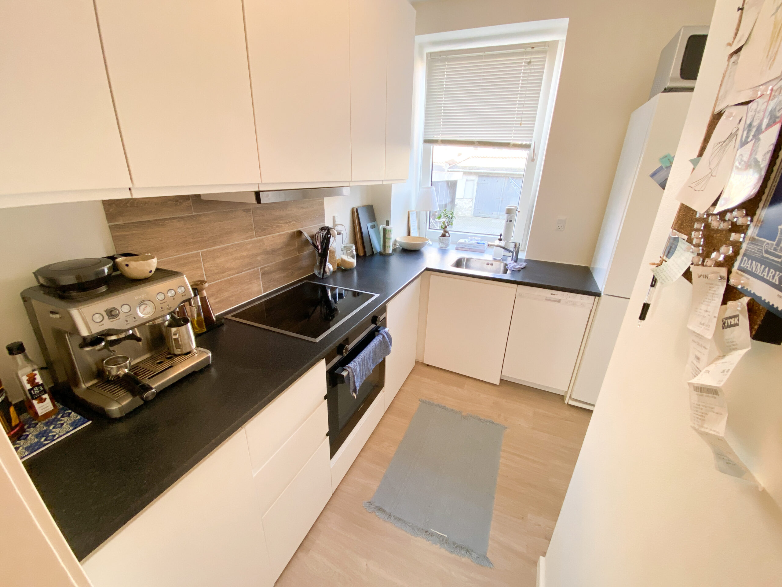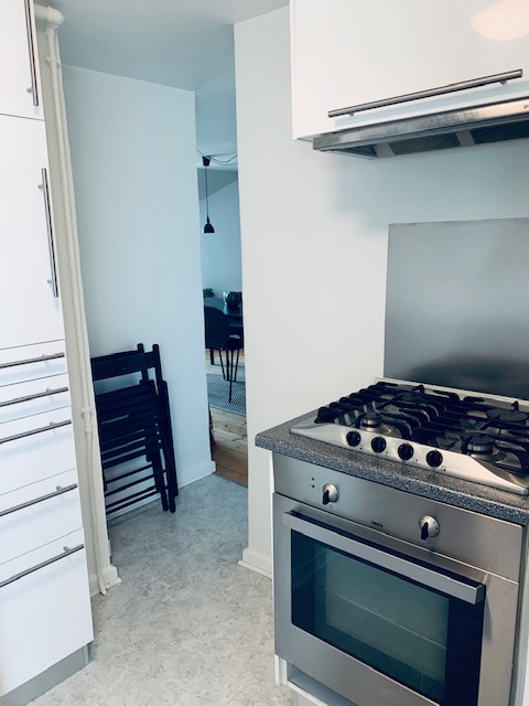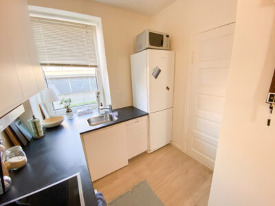 Ved siden af badeværelset har vi køkkenet, som også er nyrenoveret med helt nye lækre hvide materialer og med en opvaskemaskine installeret. Fra køkkenet er der en dør til bagtrappen, som fører ned til fælles vaskeriet i kælderen. Der er godt med plads i køkkenet, både skabs som bordplads.