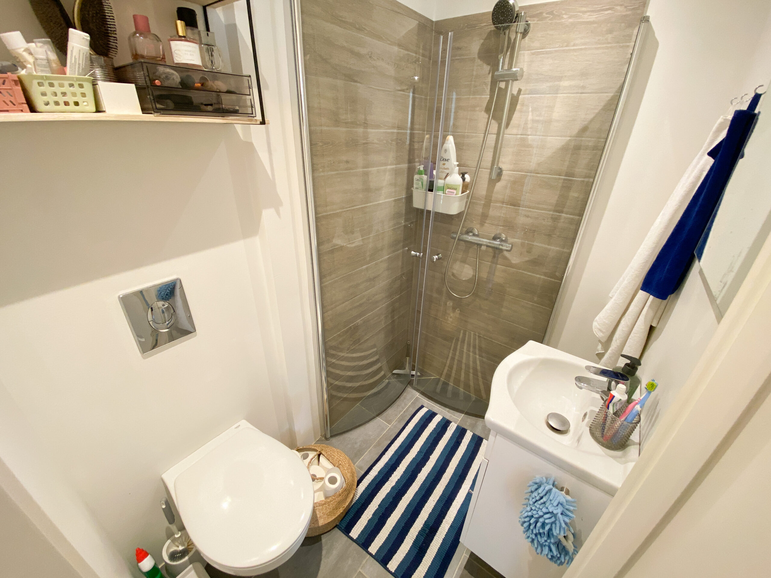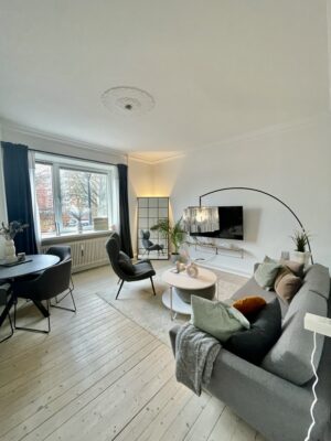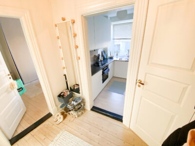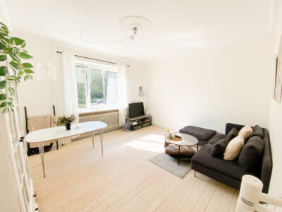 Denne skønne lejlighed er beliggende lige ved Østre Anlæg, og man kan fra stuen se ned til vandet derhenne. Man har derfor mulighed for, at ligge sig ned til den dejlige stemning og nyde solen ved blot at gå et par skridt. Når man træder ind i lejligheden kommer man til en entré, som også er en fordelingsgang. Her har man adgang til badeværelset, som er nyrenoveret med en god brusekabine, som er forholdvis sjælden i Aalborgs ældre bygninger.