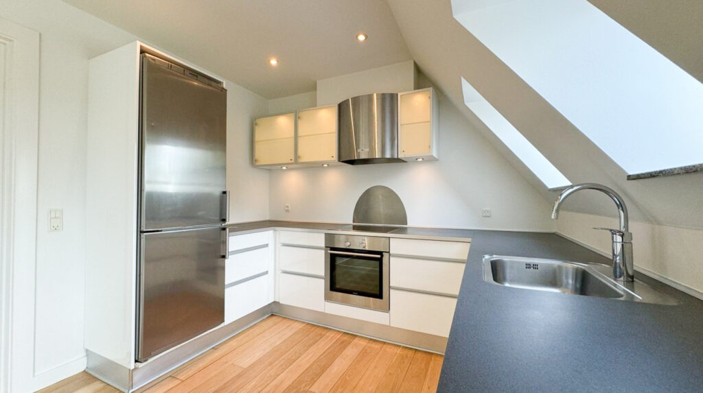Lejligheden har pænt køkken med hvidevarer i åben forbindelse til stue samt mindre soveværelse.