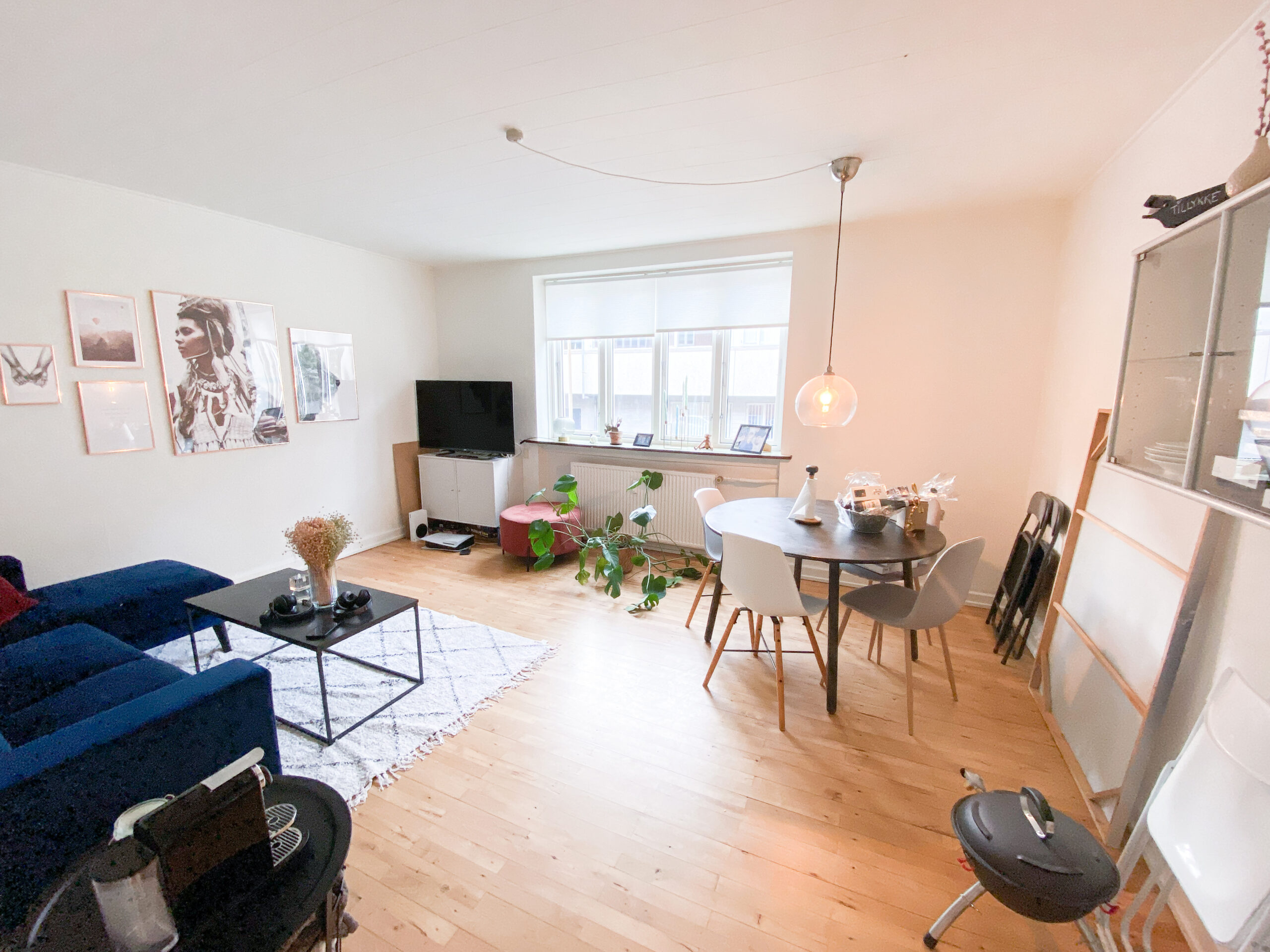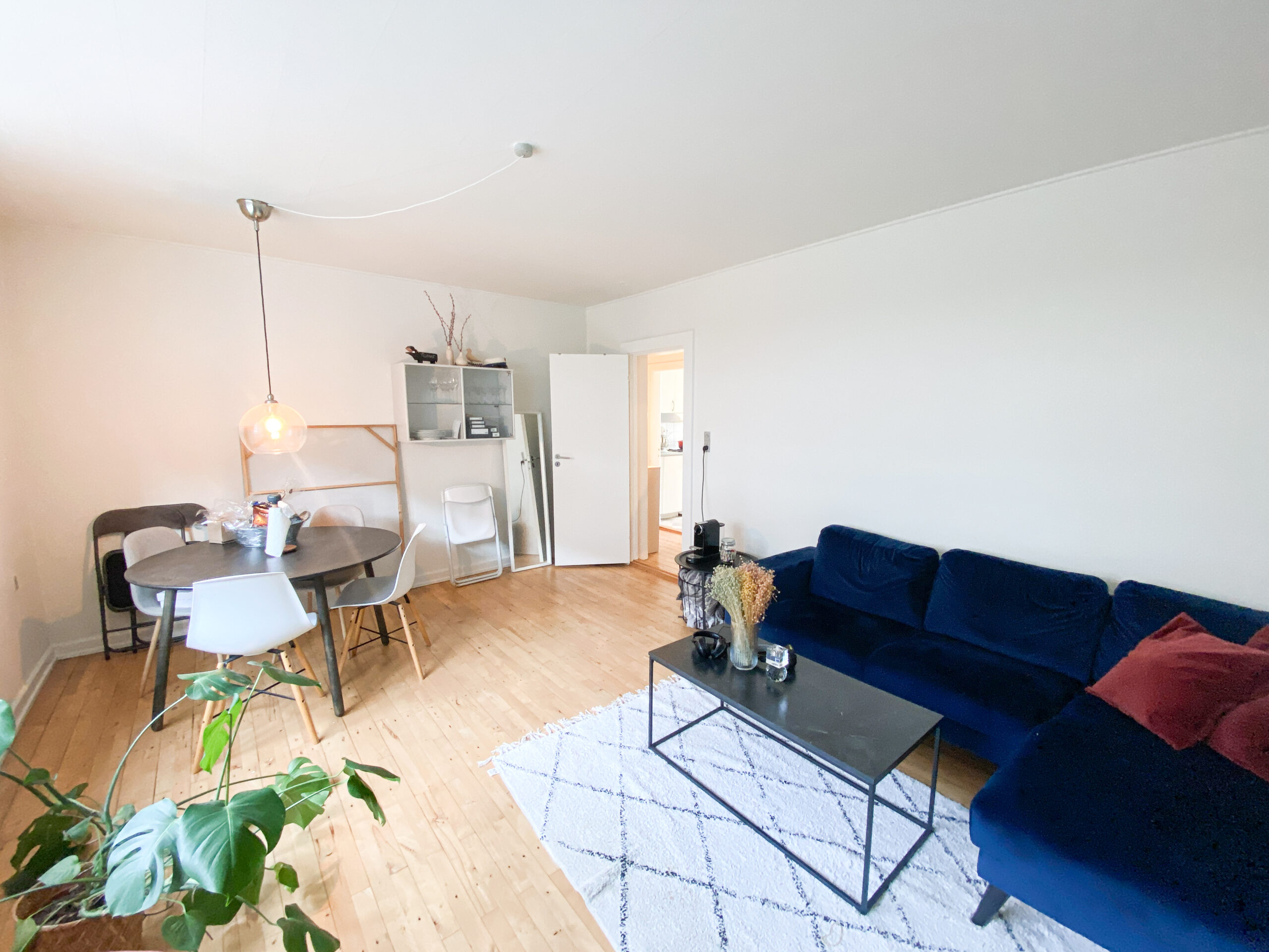 Lejlighedens hjerte er den store stue, som byder på masser af plads til både et stort spisebord og en komfortabel sofa. Det flotte vinduesparti lukker masser af lys ind og gør stuen til et lyst og indbydende opholdsrum.