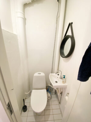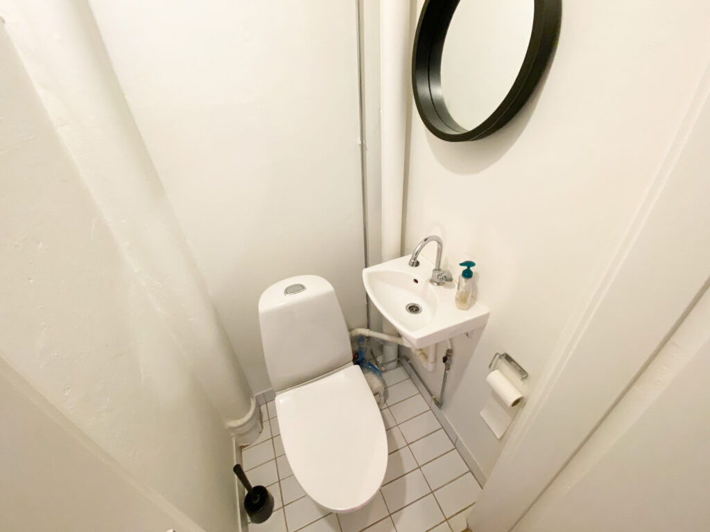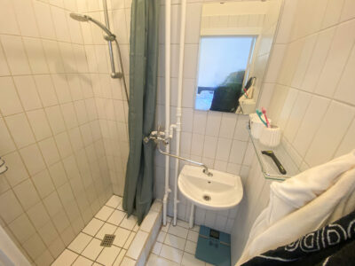 Videre gennem gangen kommer du til badeværelset, som er funktionelt indrettet i en rektangulær form. Badeværelset er opdelt i 2 sektioner. Fra gangen er der indgang til toilet og håndvask og fra soveværelset er der indgang til et rum med indbygget brusekabine og en håndvask med spejl. Begge dele er forholdvis nyrenoveret.