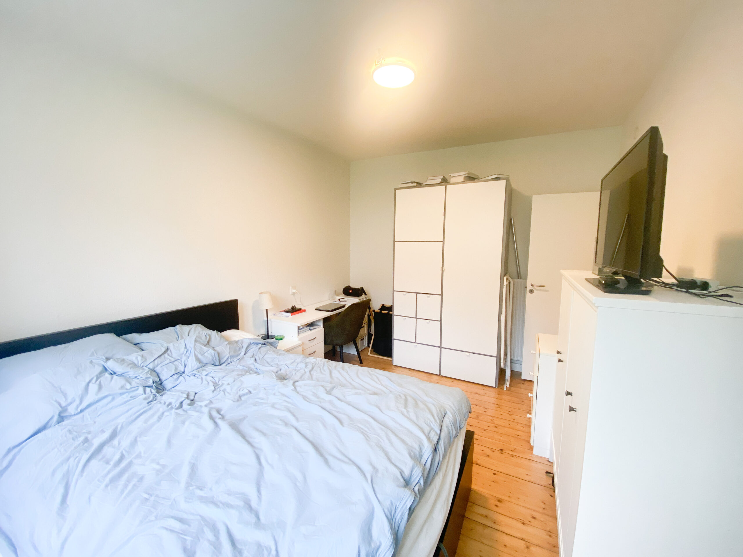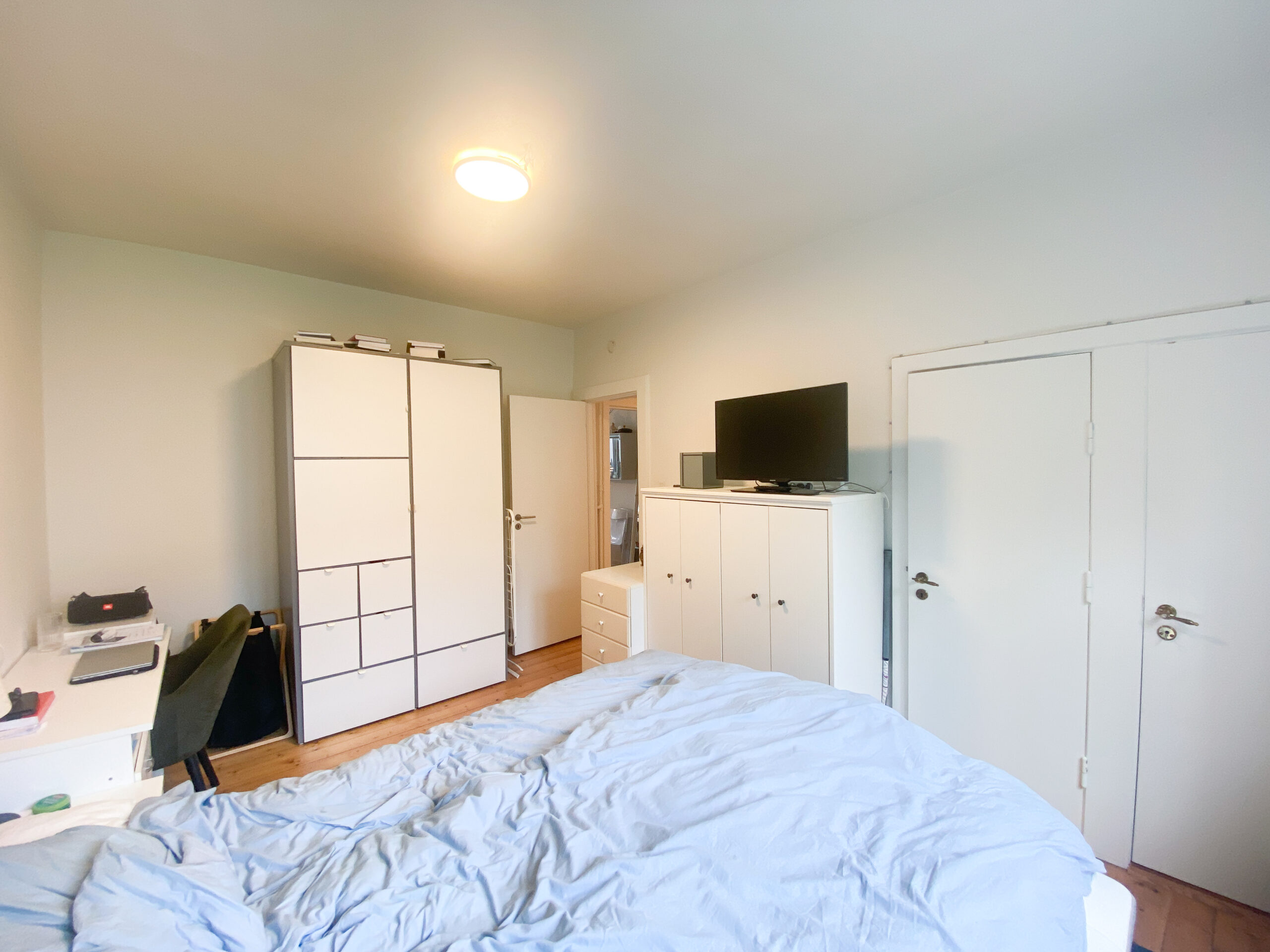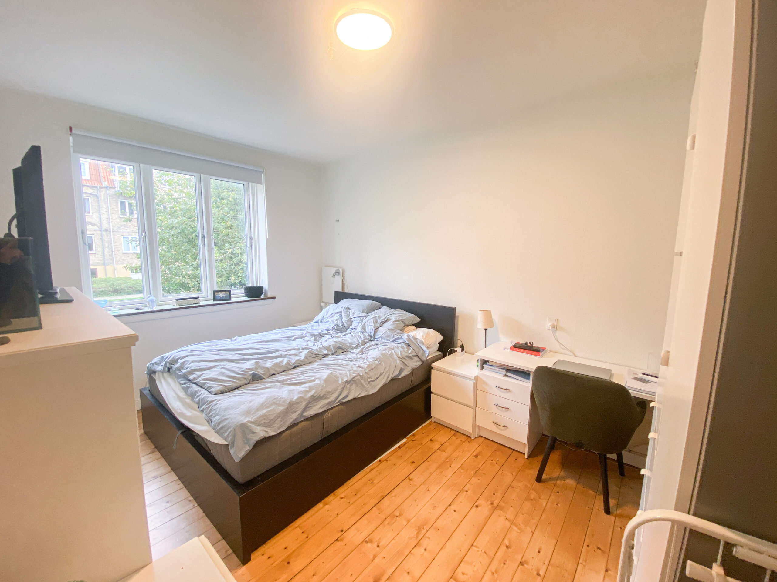 For enden af gangen finder du soveværelset, der er perfekt til både afslapning og arbejde. Rummet er rummeligt og indeholder et stort klædeskab, en komfortabel dobbeltseng og et rummeligt skrivebord. Soveværelset har også vindue mod gårdhaven, hvilket skaber en rolig og behagelig atmosfære.