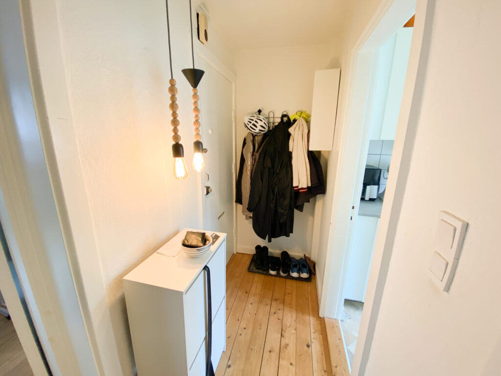 Træd ind i denne velindrettede lejlighed, hvor hver detalje er gennemtænkt for at skabe en funktionel og stilfuld boligoplevelse. Når du kommer ind, bliver du mødt af en flot fordelingsgang med elegante grå klinker, der giver et tidløst udtryk. Her er der god plads til at hænge overtøj og stille skoene.