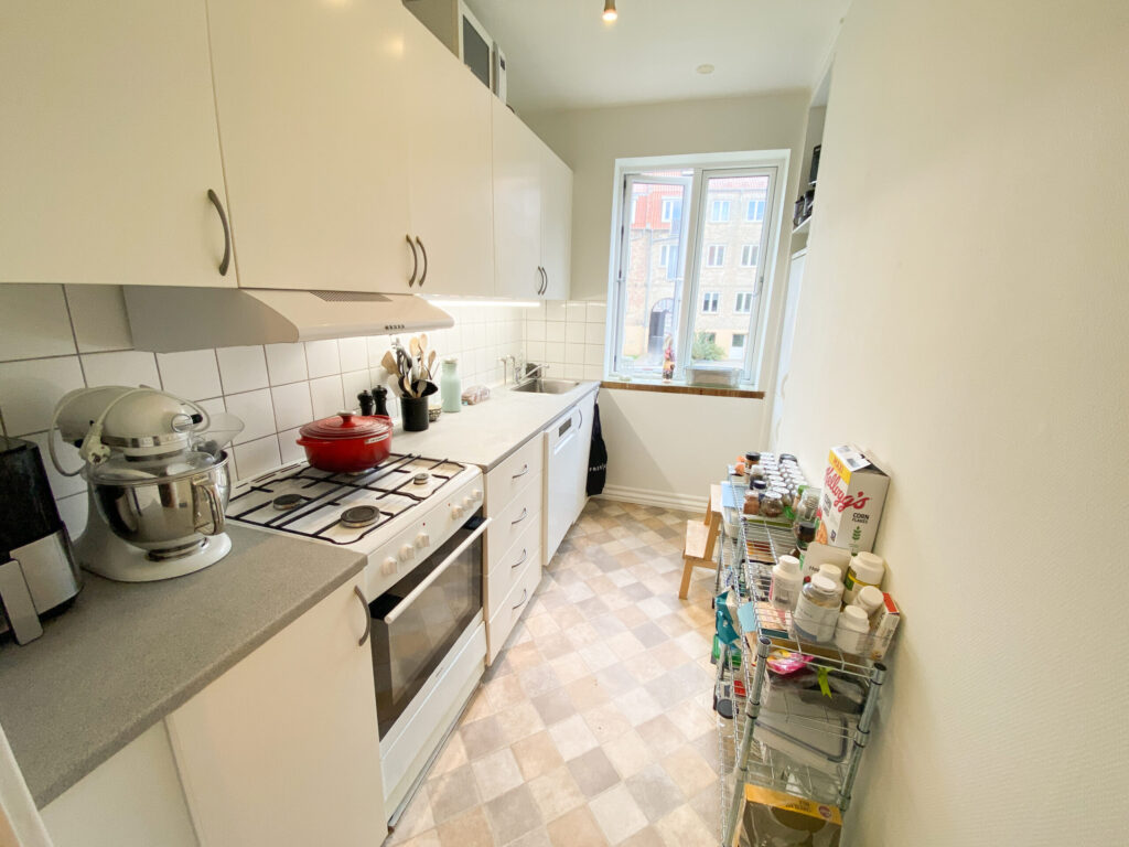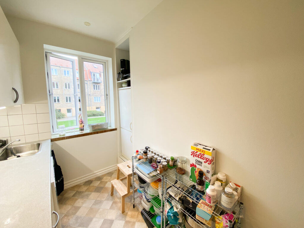 Første rum på turen er køkkenet, der emmer af moderne æstetik. Køkkenet er holdt i hvidt med grå bordplader og med skabshylder der matcher. Gulvet er et typisk køkkengulv med et sandfarvet look, der står i kontast til resten og gør det enkle køkken mere særpræget. Det indbyggede køleskab sikrer en strømlinet og praktisk løsning. Fra køkkenvinduet kan du nyde udsigten til den rolige gårdhave, som indrammer lejligheden med et grønt og fredfyldt miljø. Der er mulighed for at tilkøbe opvaskemaskinen.