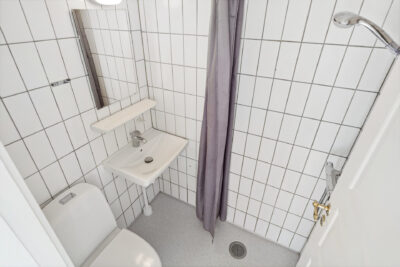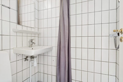 Badeværelset er med fliser på gulv og vægge.