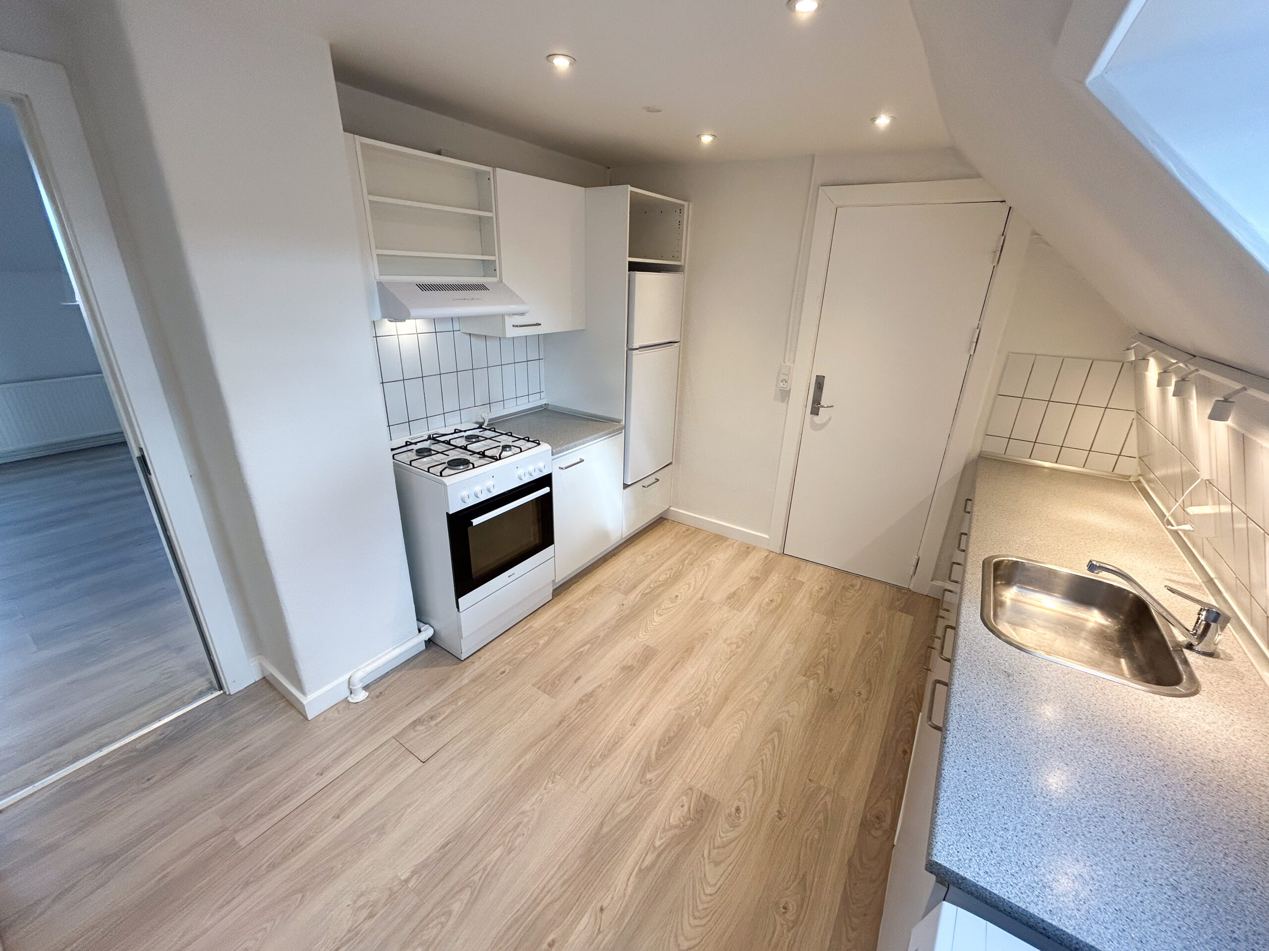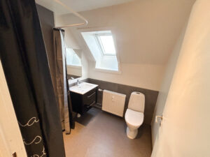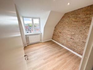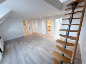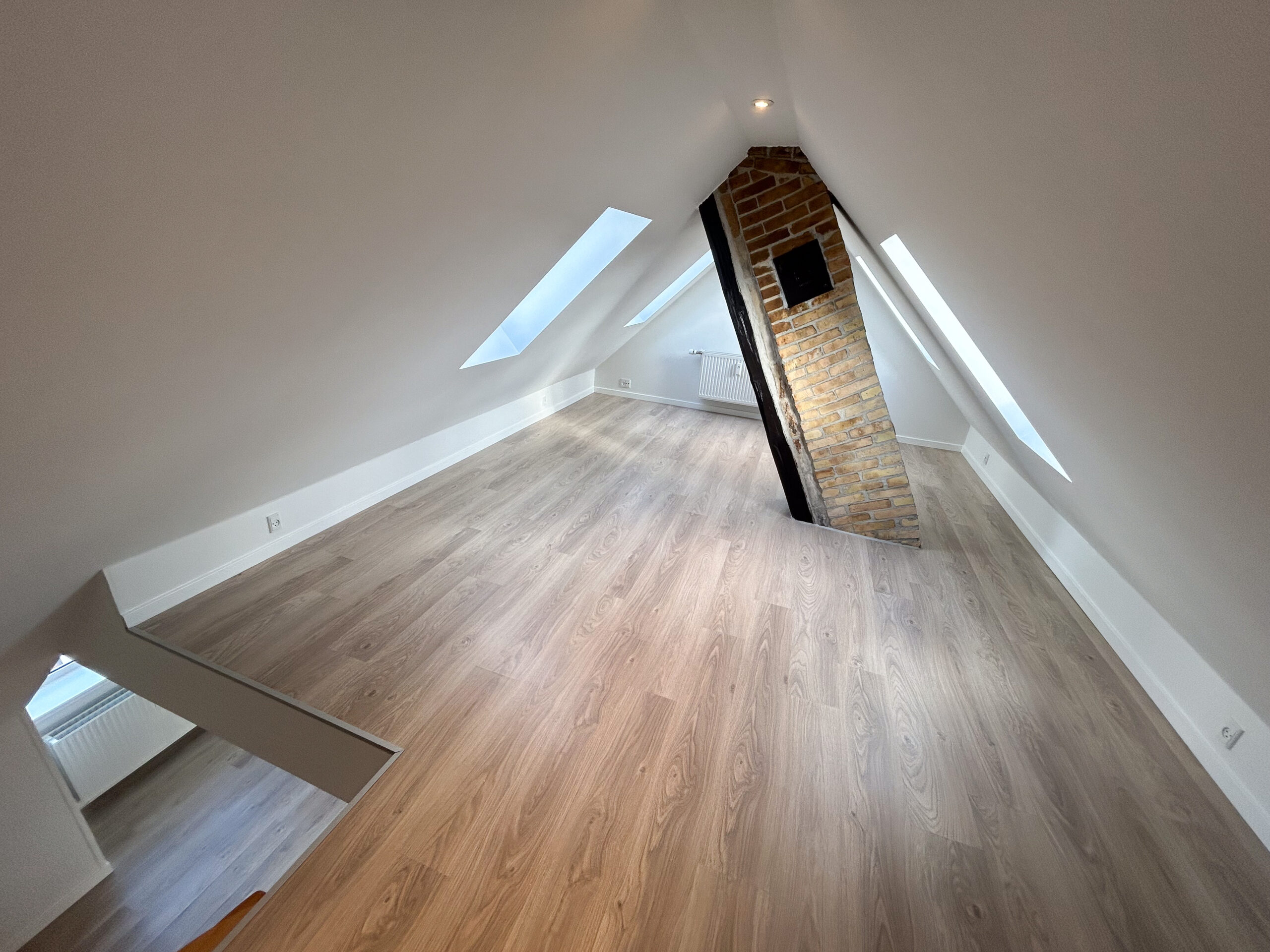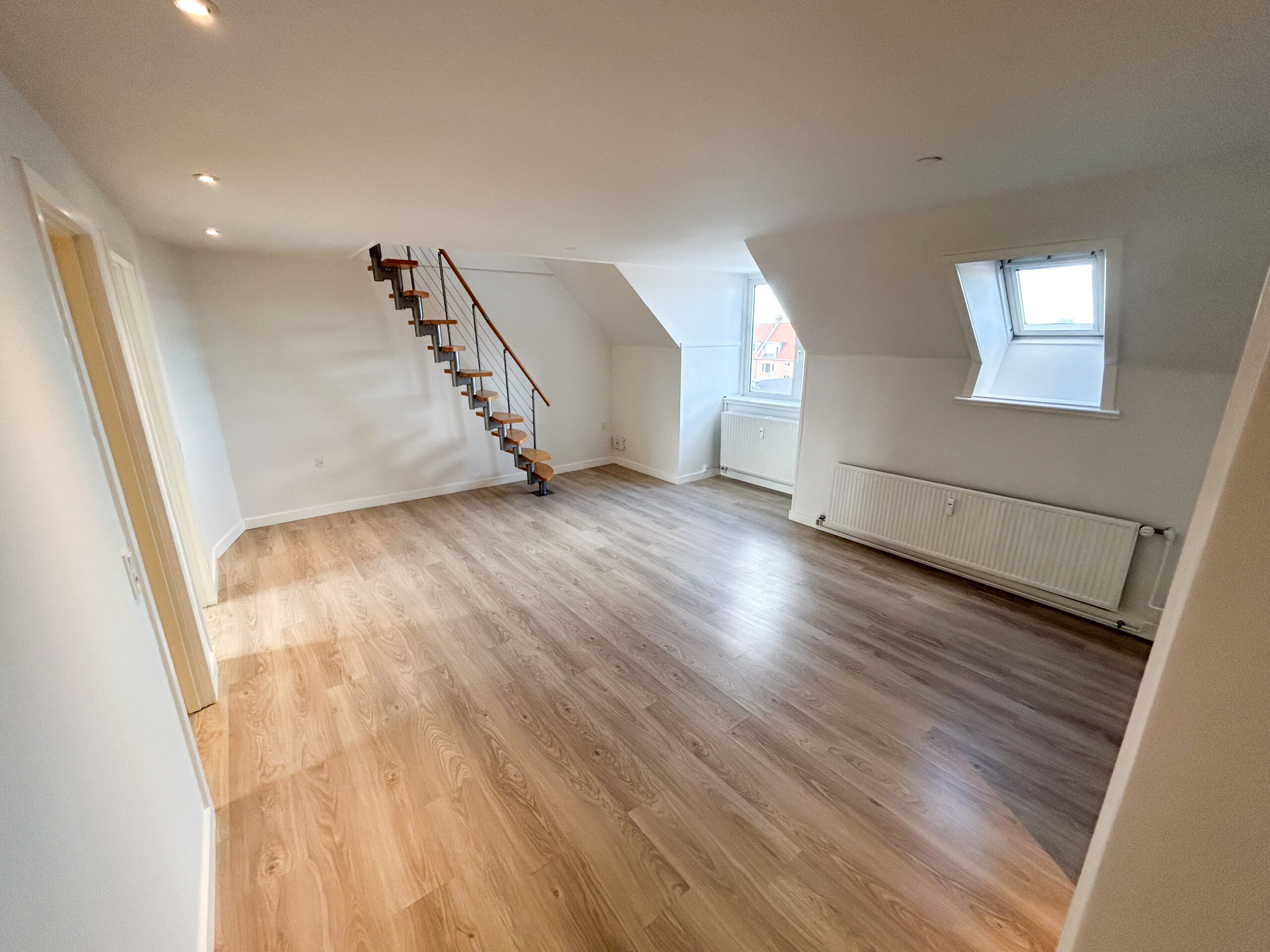 Fra entréen bevæger man sig videre ind i stuen, der både rummer plads til spisebord og hyggeligt sofaarrangement. Stuen fungerer som lejlighedens naturlige samlingspunkt, og herfra fører en trappe op til den rummelige hems. Hemsen giver mange anvendelsesmuligheder – den kan med fordel indrettes som kontor, gæsteværelse eller et ekstra opholdsrum – og byder samtidig på en skøn udsigt.