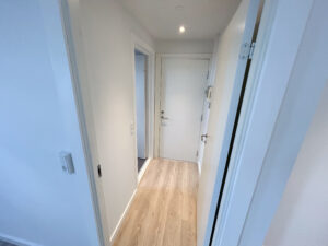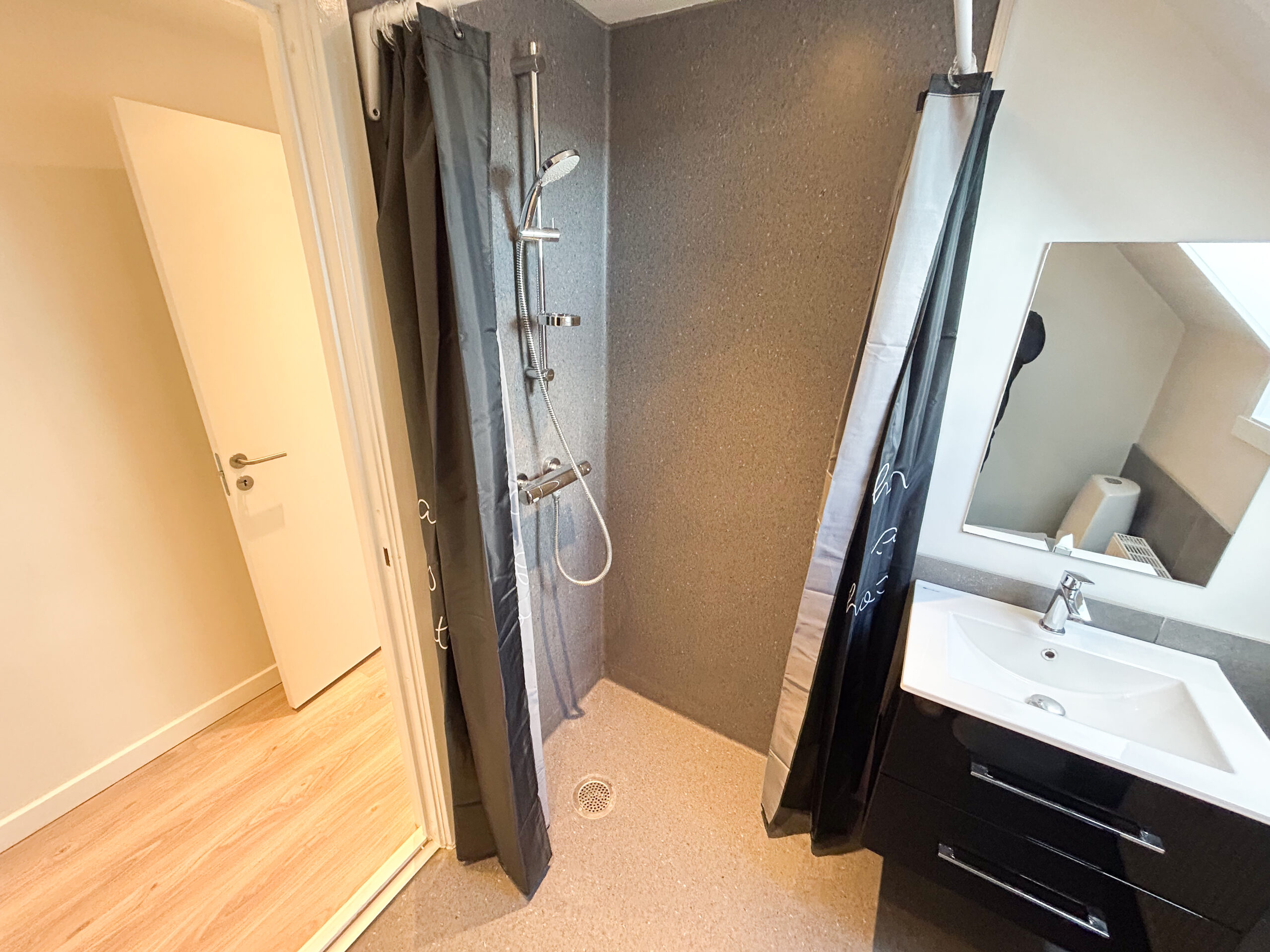Man træder ind i en lille entré, hvorfra der er adgang til lejlighedens badeværelse. Badeværelset fremstår moderne i mørke nuancer og er indrettet med separat bruseafsnit.