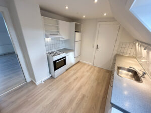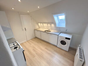 Køkkenet er lyst og indbydende med hvide elementer og god skabsplads. Det er udstyret med vaskemaskine, og der er desuden mulighed for installation af en bordopvaskemaskine, hvis det ønskes.