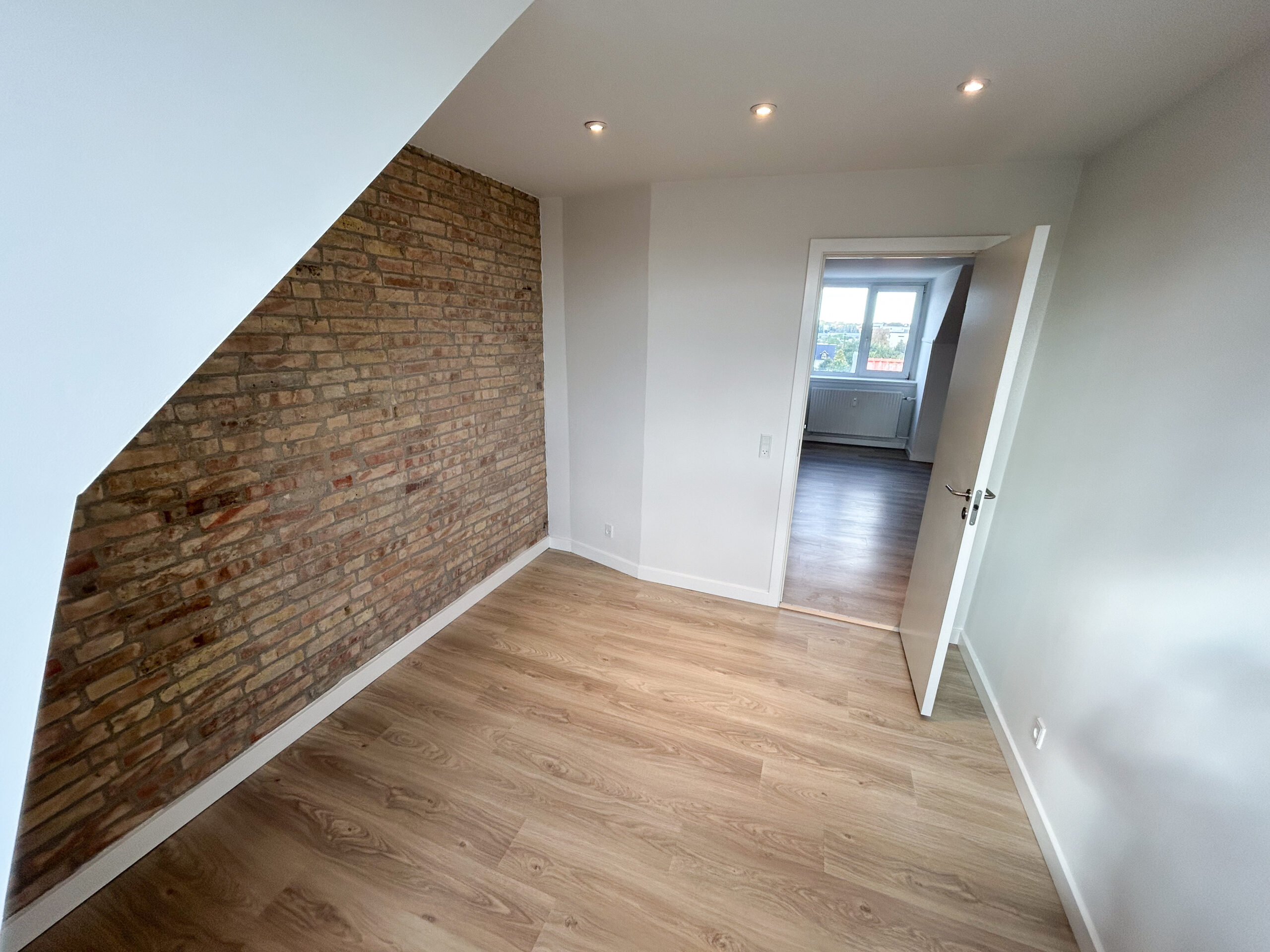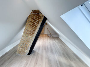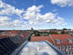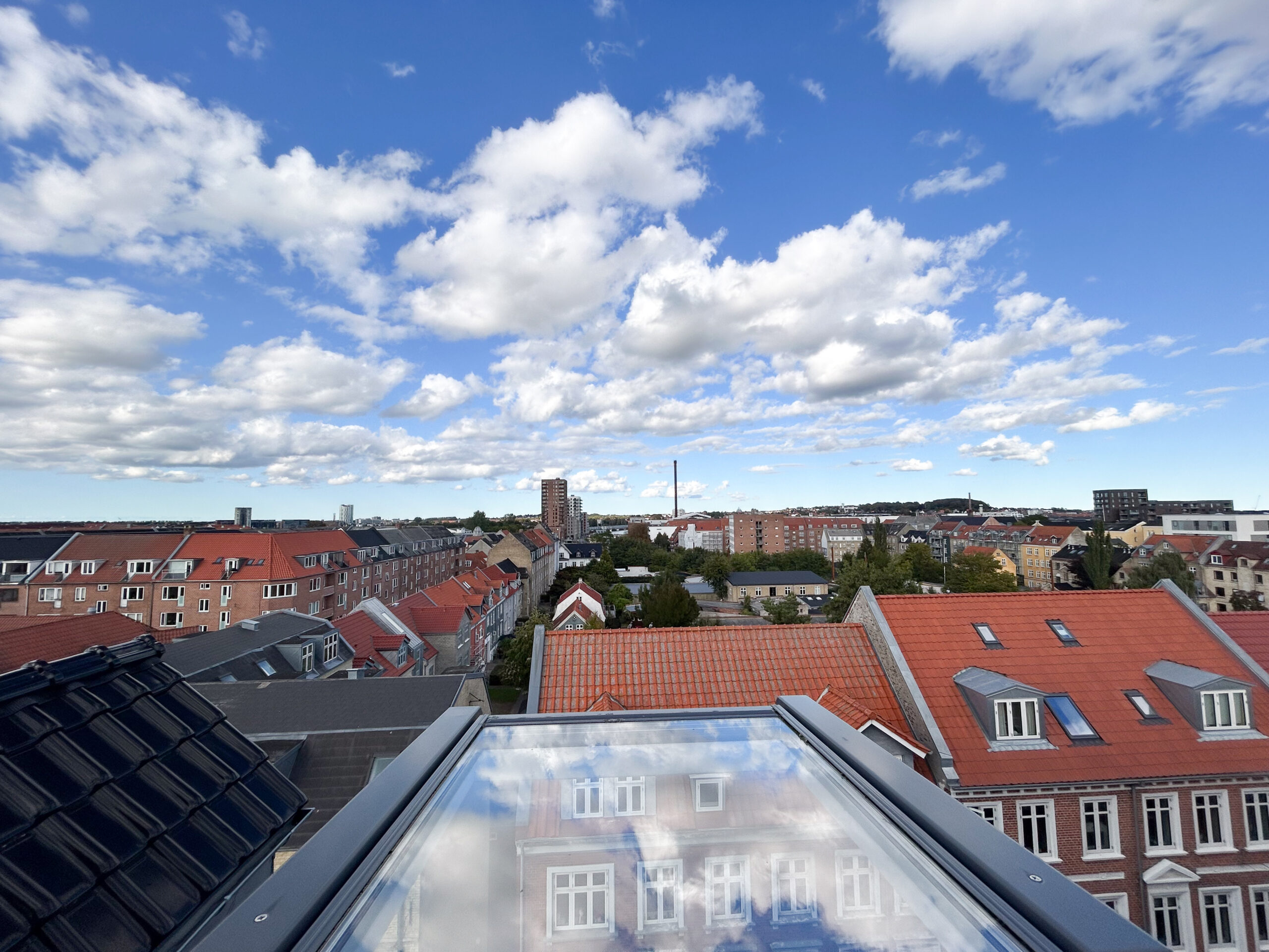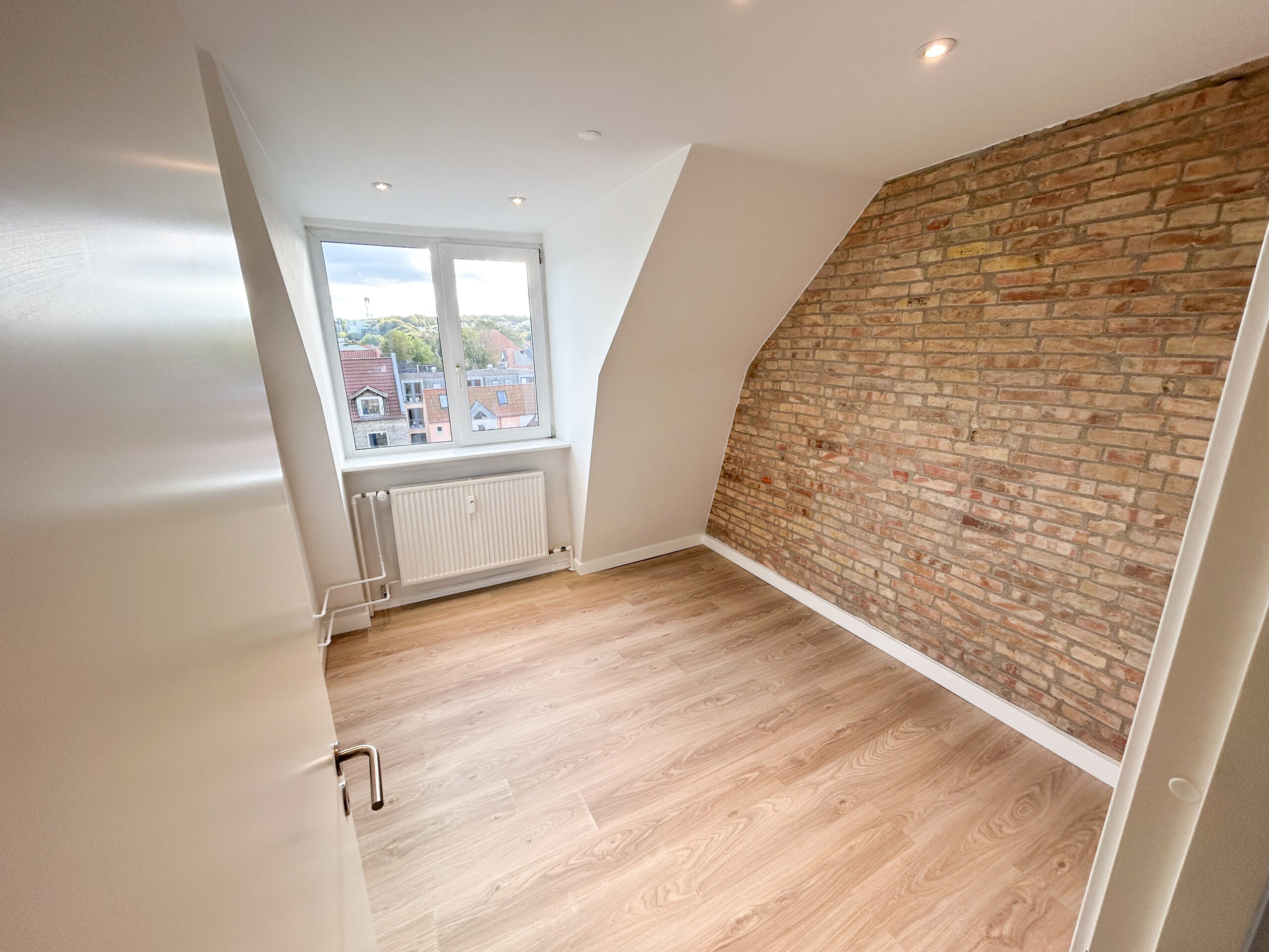 Lejligheden rummer også et soveværelse med en flot rå New Yorker-væg, som tilfører rummet karakter og stemning. Herfra får man, ligesom fra hemsen, glæde af den dejlige udsigt.
