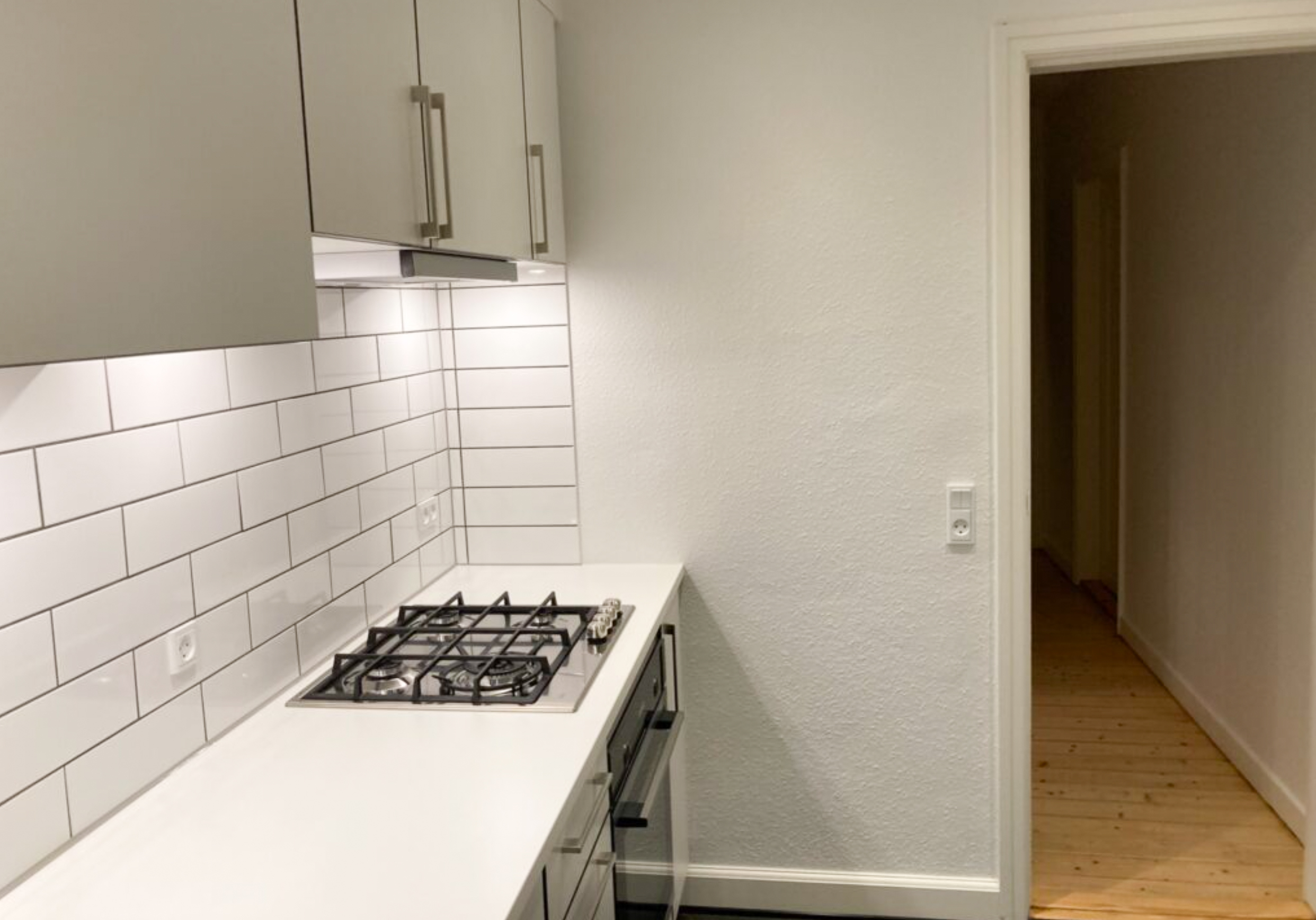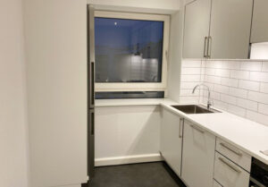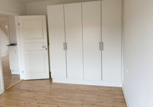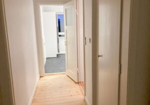 Denne velbeliggende lejlighed er moderniseret med lækkert køkken med hvidt inventar og hvid bordplade samt alt i hårde hvidevarer.