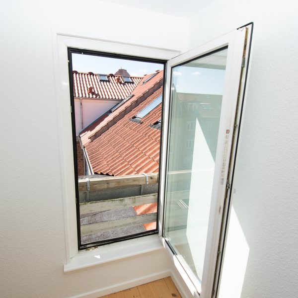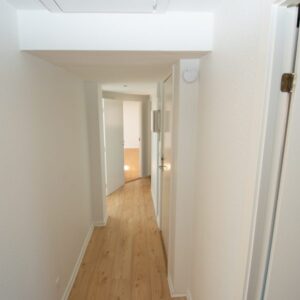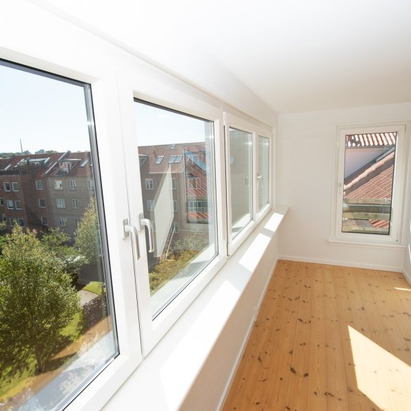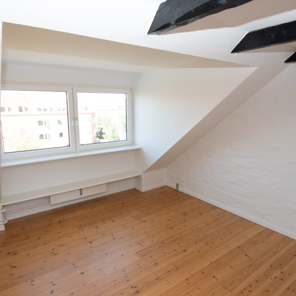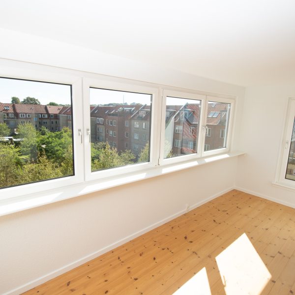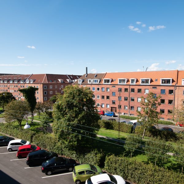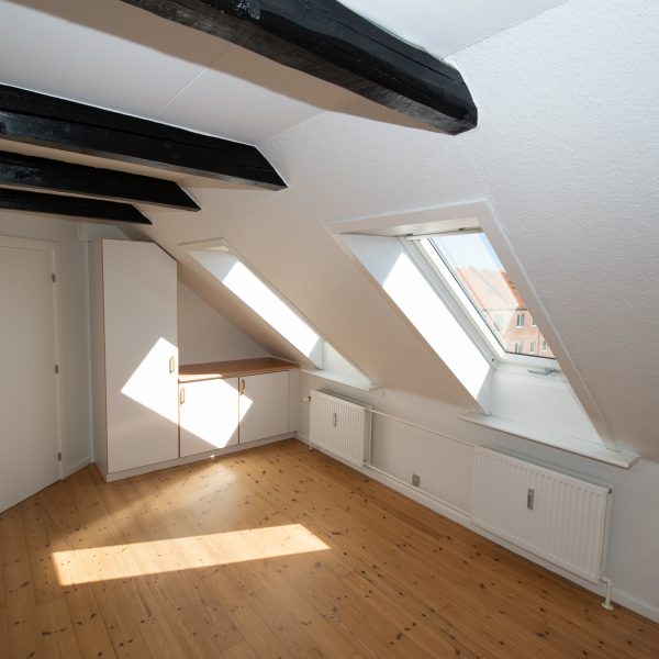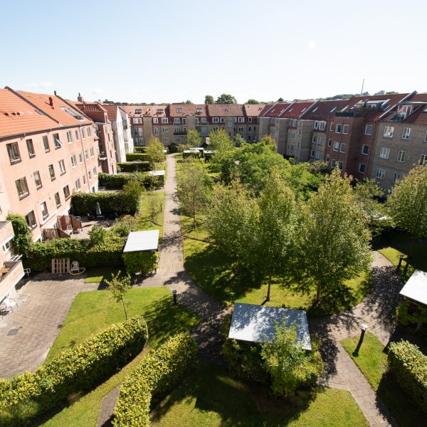 Alle værelser er rummelige med nylakerede trægulve og faste skabe – det ene med fransk altan og vestvendt udsigt over en flot, grøn fælleshave.
