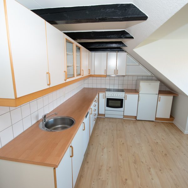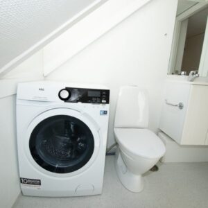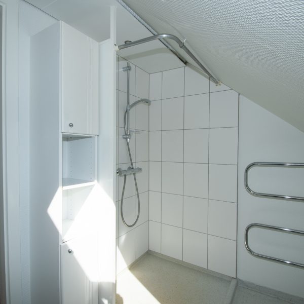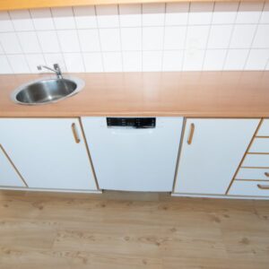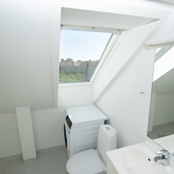 Det store spisekøkken er lejlighedens hjerte med moderne hvidevarer, herunder opvaskemaskine og kombineret køle-/fryseskab, samt god plads til spisebord ved udsigtsvindue. Badeværelset er moderne med separat bruseniche, vaskesøjle og elegante detaljer som håndklædetørrer og spots i loftet.