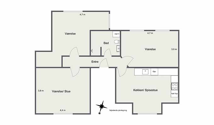 Velkommen til en lys og velholdt lejlighed med god planløsning og mange fine detaljer. Lejligheden består af tre store værelser, et indbydende spisekøkken, pænt badeværelse og en fordelingsentré – perfekt som delelejlighed for op til tre personer.