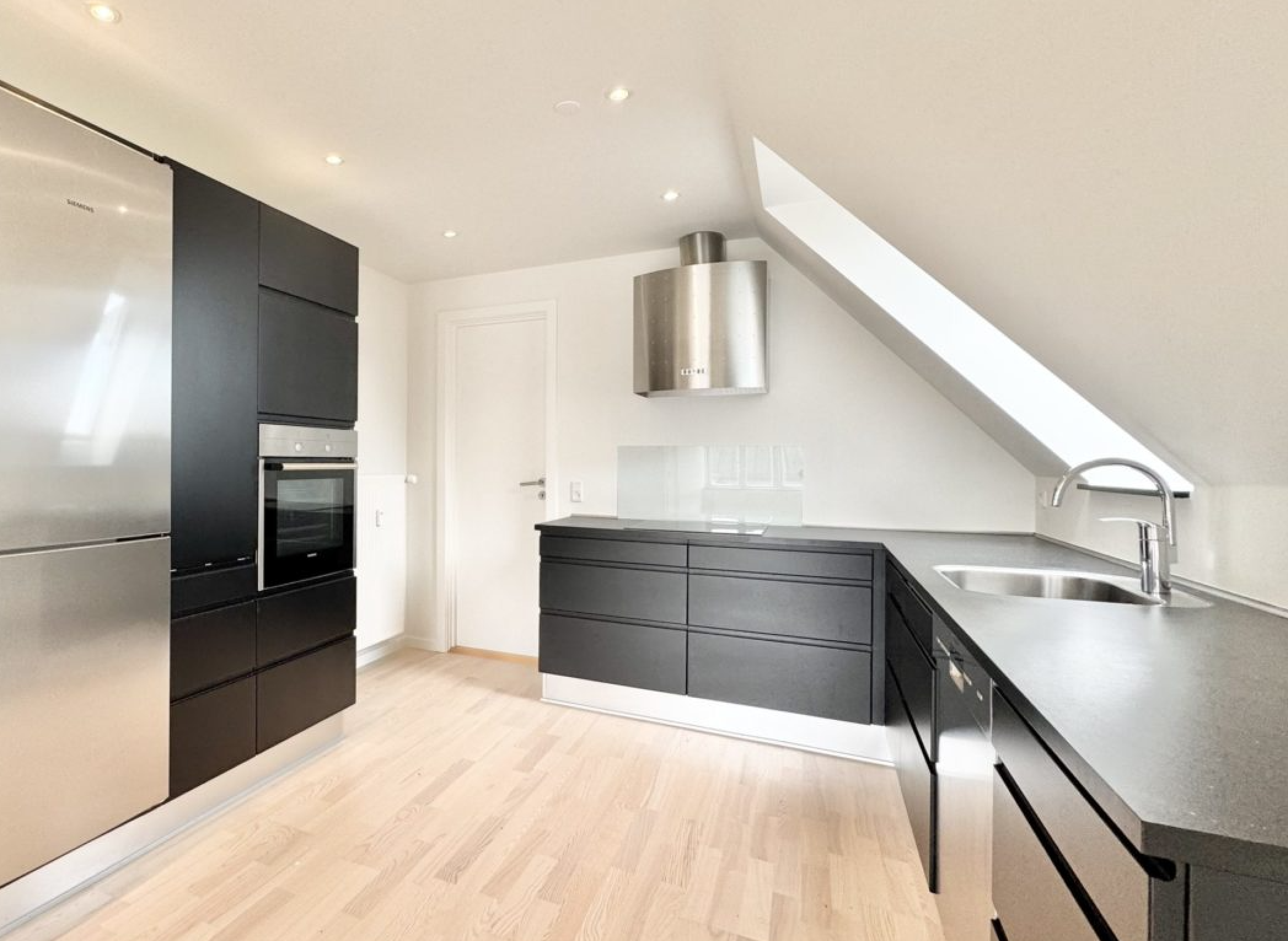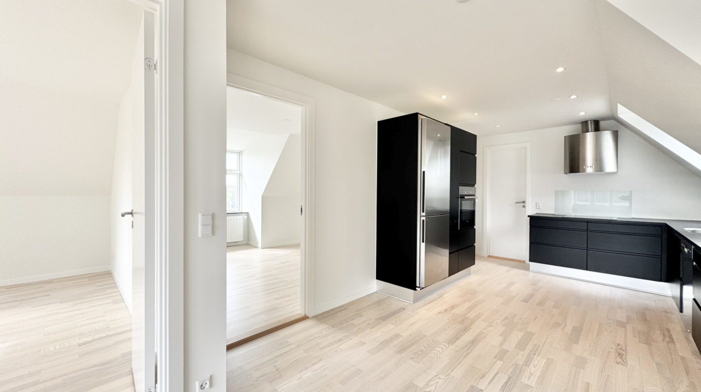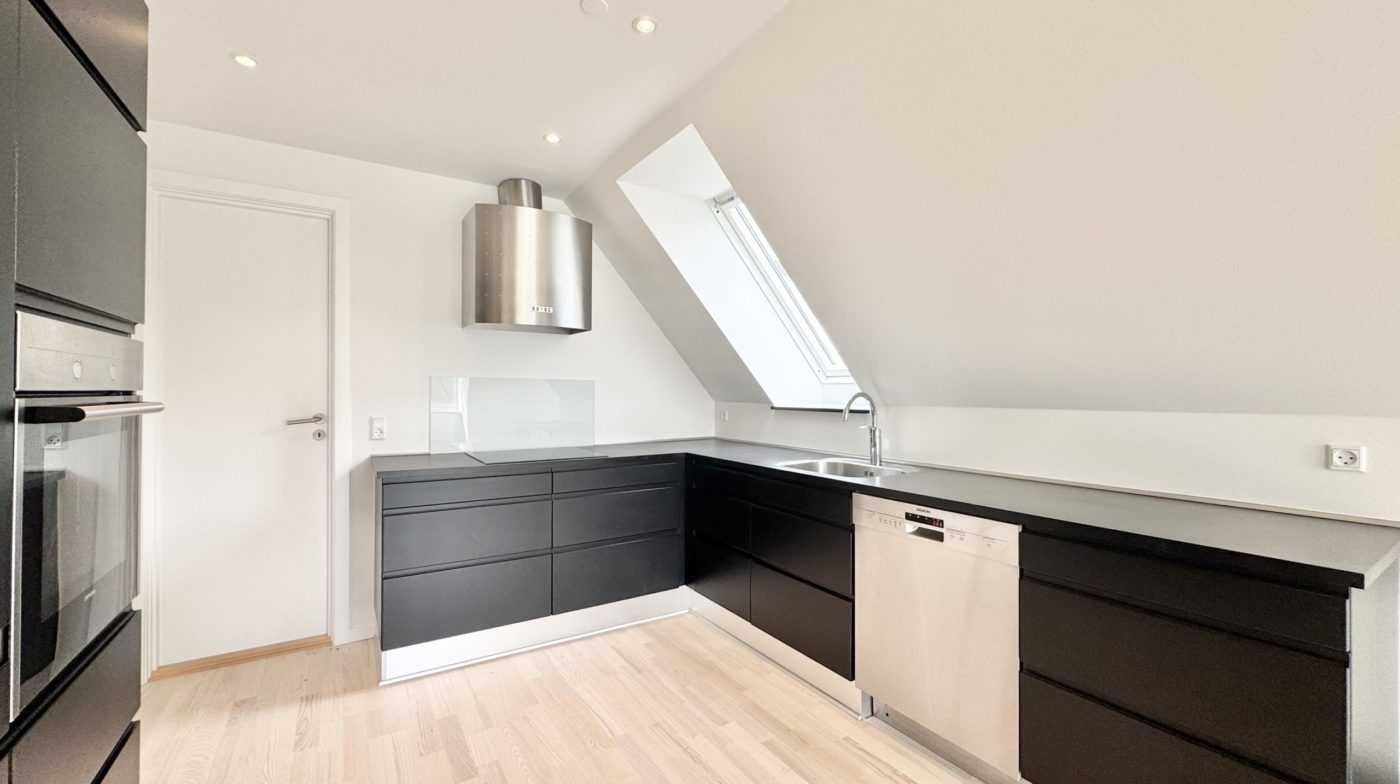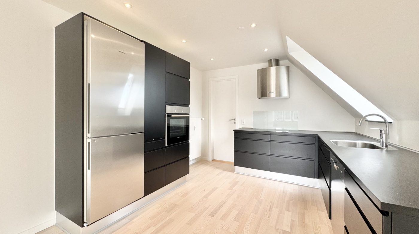 Lejligheden byder på en god entré med adgang til et flot, nyt gæstetoilet. Det moderne sorte køkken er fuldt udstyret med hårde hvidevarer – inkl. opvaskemaskine – og har desuden god plads til spisebord. Køkkenet er i åben forbindelse med en stor, lys stue, hvilket skaber et indbydende opholdsrum.