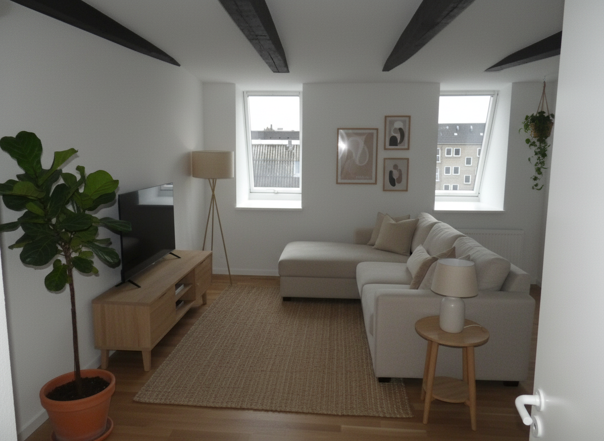 Velkommen til denne taglejlighed hvor lys møder charme. En indflytningsklar bolig med en behagelig atmosfære.
