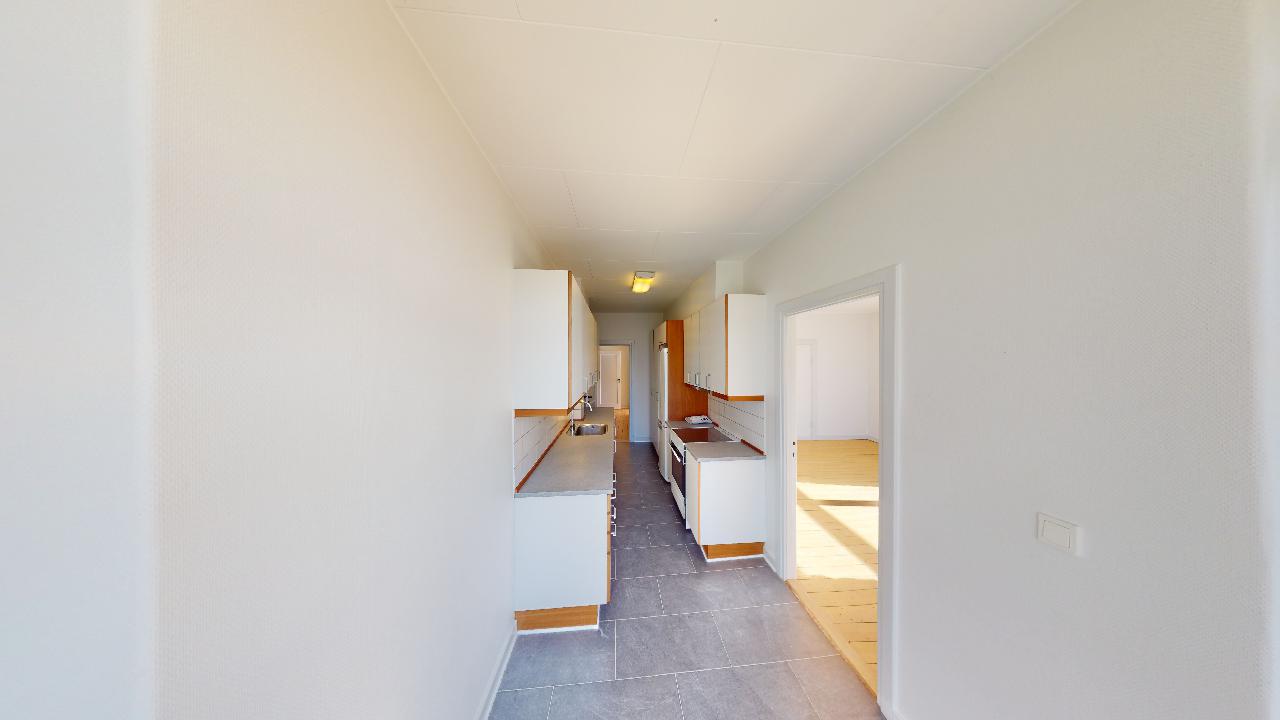 Denne lejlighed byder på en veludnyttet planløsning med tre gode værelser, der skaber en hyggelig atmosfære. De lyse rum og den generøse kvadratmeter gør det muligt at indrette sig både praktisk og stilfuldt.