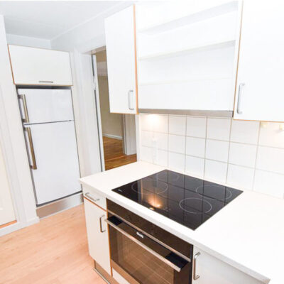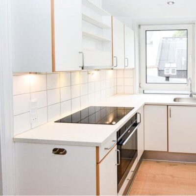 Lejligheden byder på et nyt og moderne køkken med køle-/fryseskab, glaskeramisk kogeplade, indbygningsovn, udtræksemhætte og flotte LED spots, der skaber en lys og funktionel arbejdsplads. Køkkenet har adgang gennem det rummelige soveværelse.