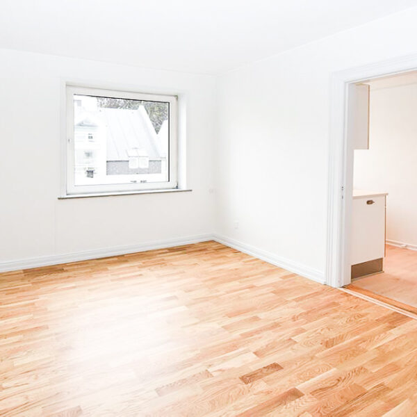 Stuen er dejlig lys og indbydende, med nyt egeparketgulv og store vinduer, der sikrer et flot lysindfald dagen igennem.