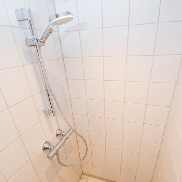 Badeværelset er indrettet med fokus på både funktion og æstetik – her får du stor bruseniche, spejl med indbygget lys, LED spots og et praktisk underskab under vasken.