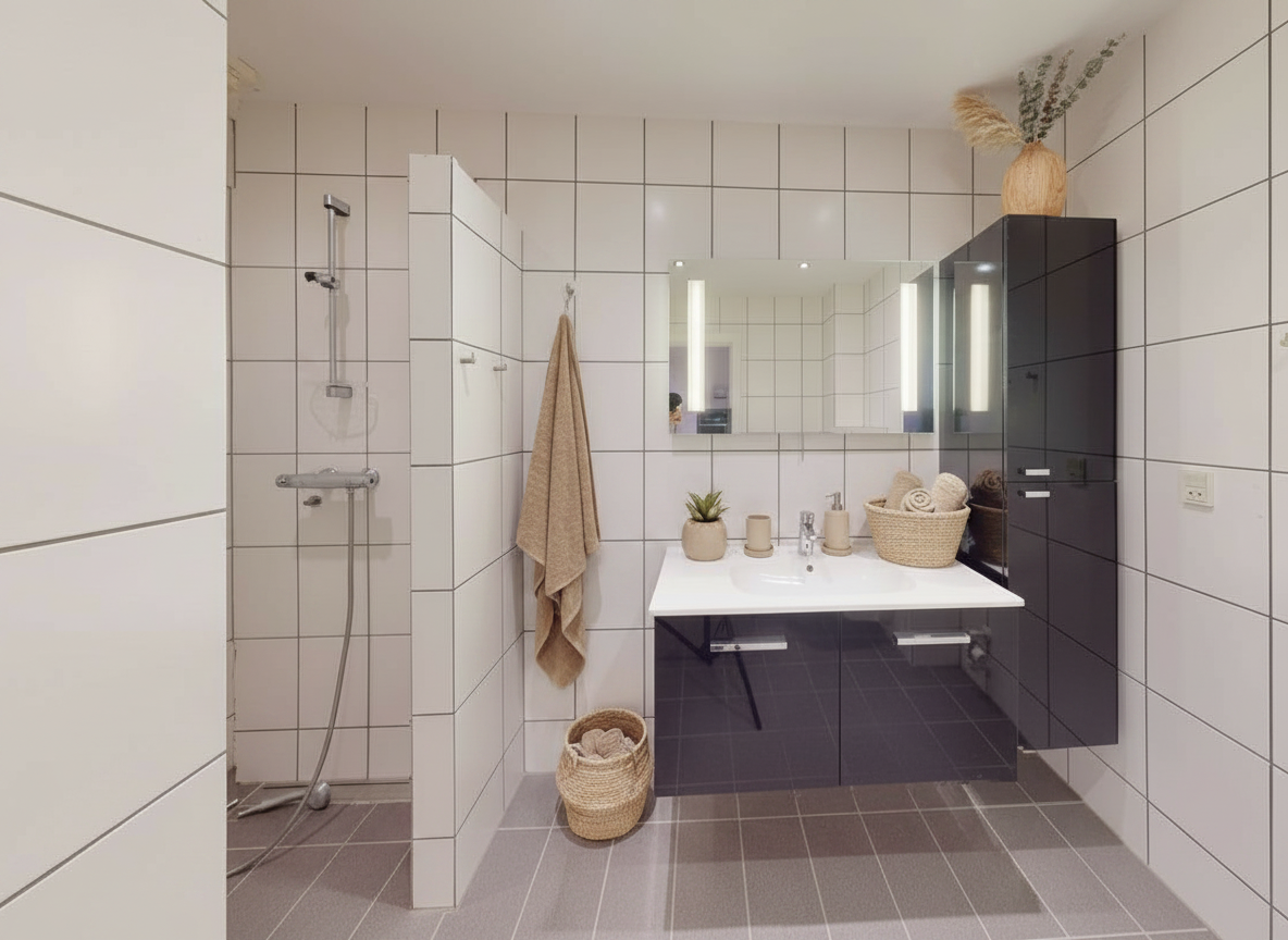 Lejligheden byder på et stort, moderne køkken udstyret med et rummeligt køle-fryseskab og ovn i ergonomisk højde. Det stilrene køkken prydes af hvide skabslåger og sorte klinker på væggen, mens de gråsorte klinker på gulvet skaber en flot kontrast. De to værelser har et smukt lysindfald fra de store vinduespartier, hvilket giver en varm og indbydende stemning. Badeværelset er moderne med praktisk skabsplads under og ved siden af vasken, et væghængt toilet samt en stor separat brusekabine.