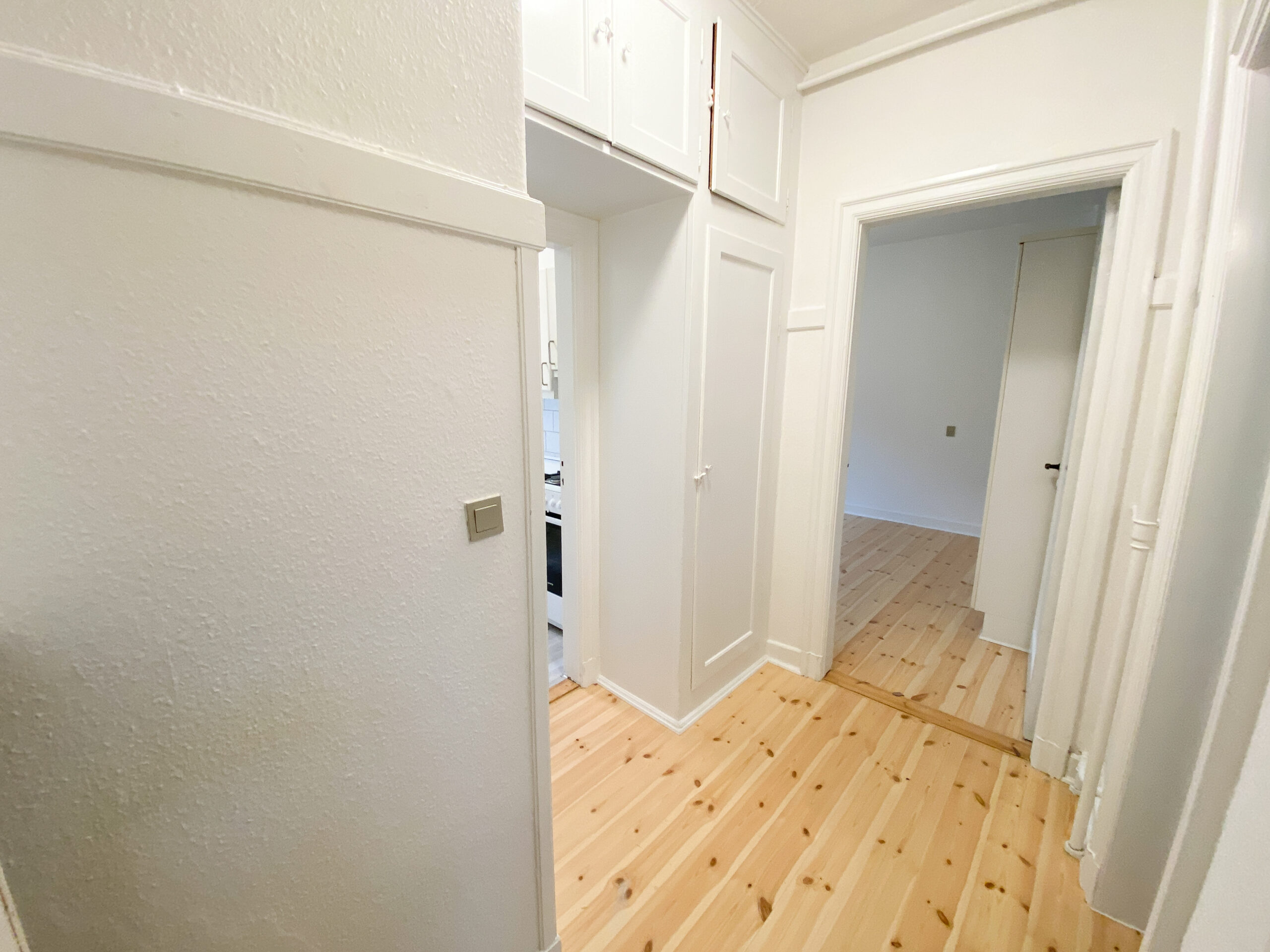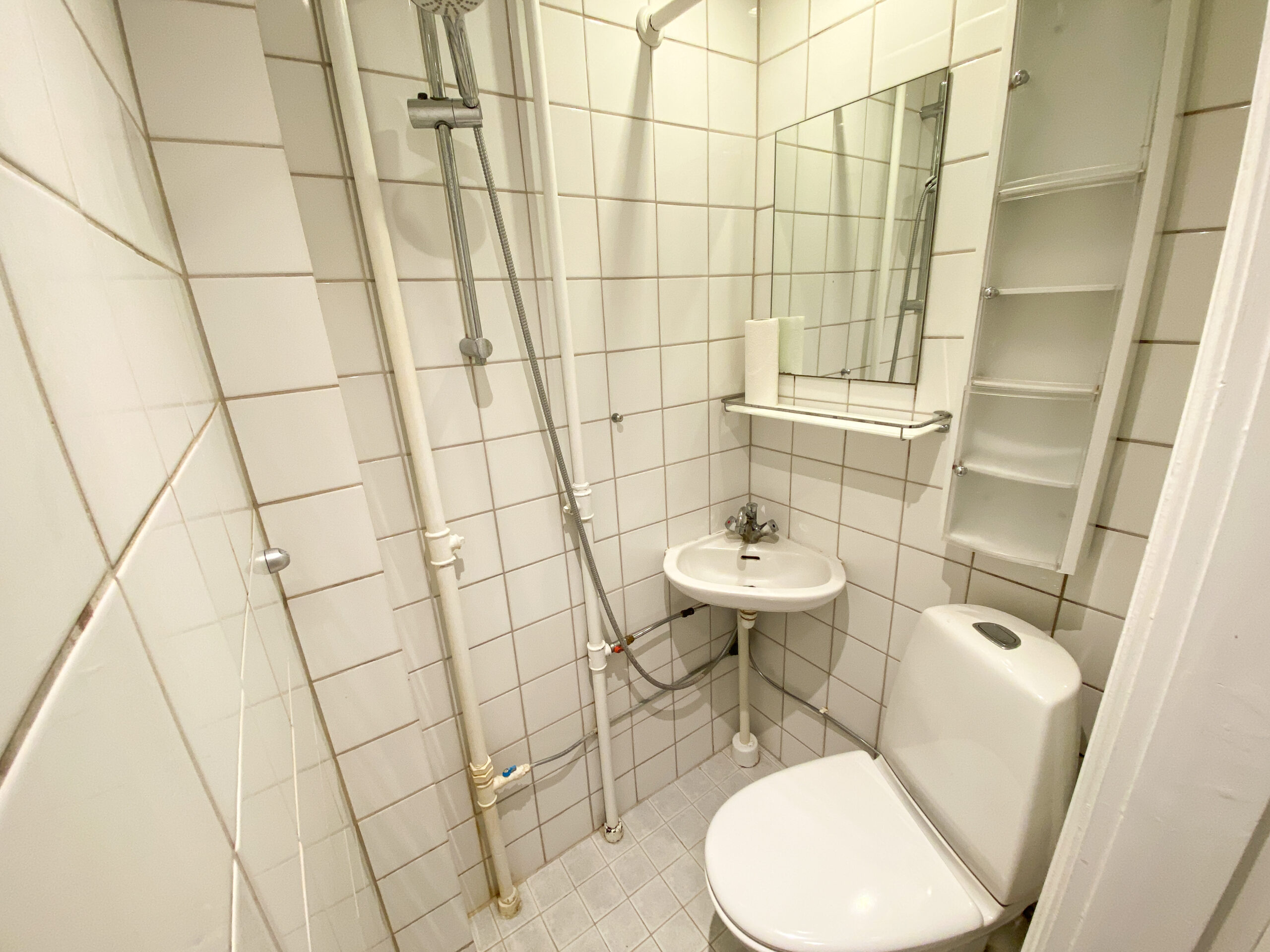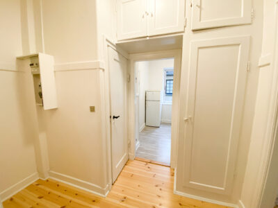 I entréen finder du praktiske indbyggede skabe med god opbevaringsplads. Herfra er der adgang til et mindre badeværelse med klassiske hvide klinker.