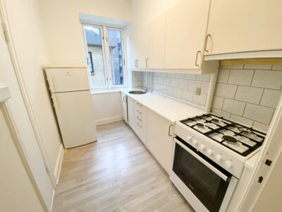 Køkkenet er ligeledes holdt i hvide nuancer og byder på fin bordplads samt gode opbevaringsmuligheder.