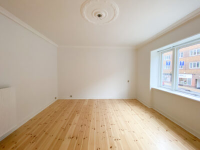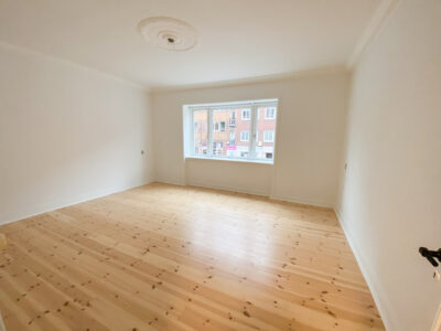 Stuen er et stort, åbent og lyst rum med et flot vinduesparti, der lader masser af dagslys strømme ind. Her er der god plads til både sofaarrangement og spiseplads, hvilket gør rummet til lejlighedens naturlige samlingspunkt.