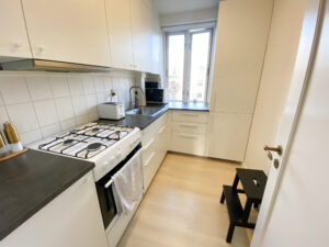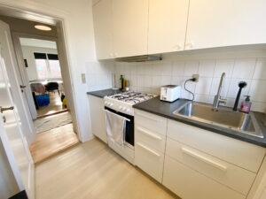 Køkkenet er ligeledes holdt i hvide nuancer og byder på fin bordplads samt gode opbevaringsmuligheder.
