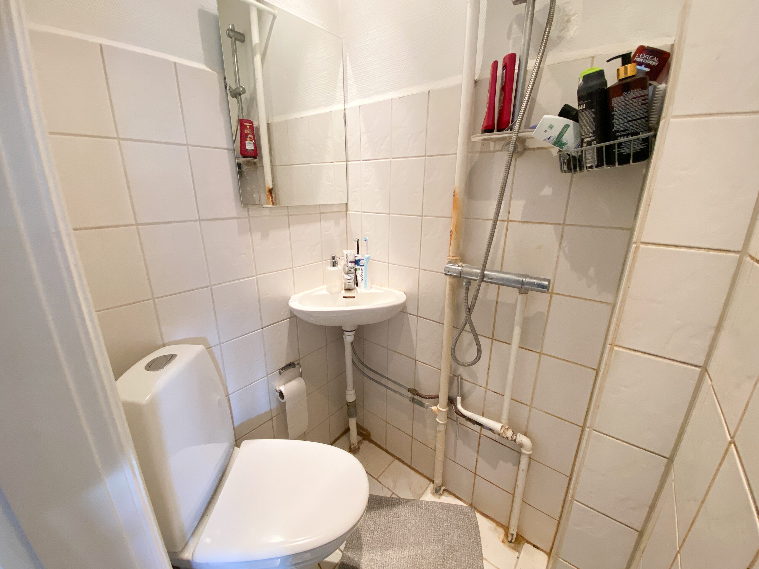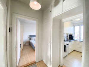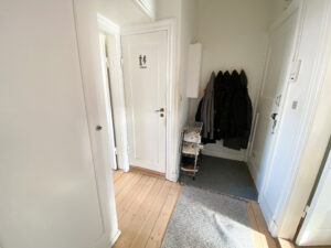 I entréen finder du praktiske indbyggede skabe med god opbevaringsplads. Herfra er der adgang til et mindre badeværelse med klassiske hvide klinker.