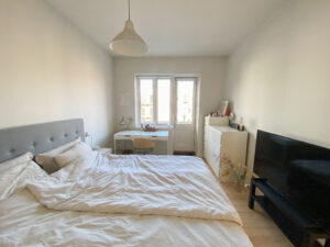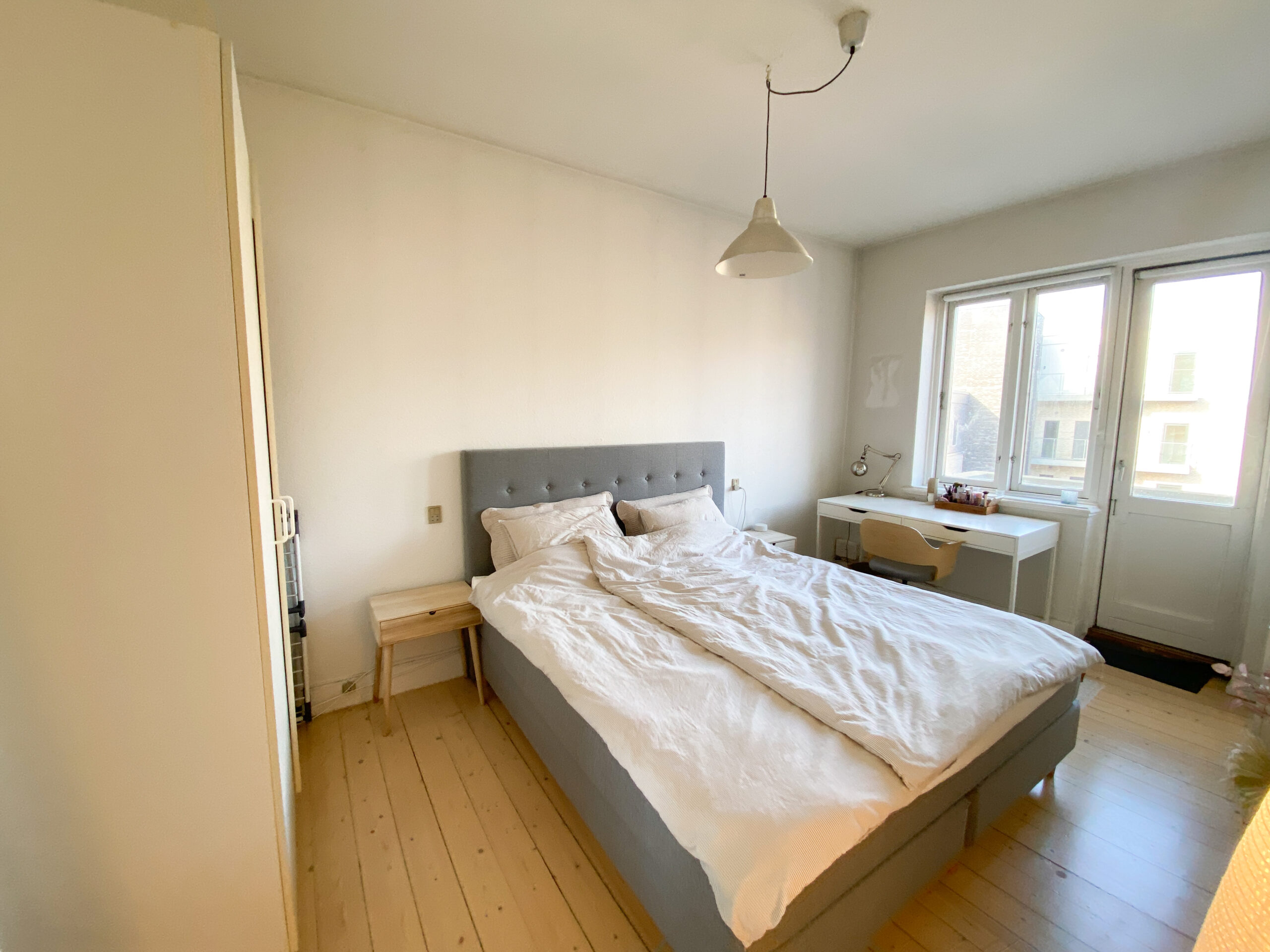 Soveværelset har en behagelig størrelse og rummer både en dobbeltseng, et skrivebord og et stort klædeskab. Fra soveværelset er der desuden udgang til en vestvendt altan, hvor du kan nyde eftermiddags- og aftensolen.