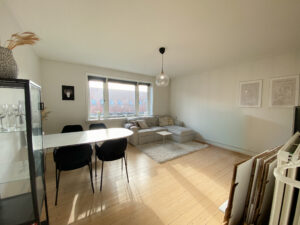 Stuen er et stort, åbent og lyst rum med et flot vinduesparti, der lader masser af dagslys strømme ind. Her er der god plads til både sofaarrangement og spiseplads, hvilket gør rummet til lejlighedens naturlige samlingspunkt.