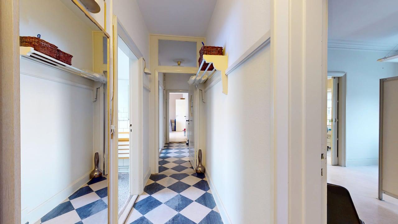 Lejligheden byder på en generøs planløsning med fem værelser, der giver mulighed for både privatliv og sociale stunder. De store vinduer lader lyset strømme ind og skaber en lys og indbydende stemning. Her er plads til at indrette sig med både komfortable møbler og personlige detaljer, så du kan skabe dit drømmehjem.