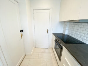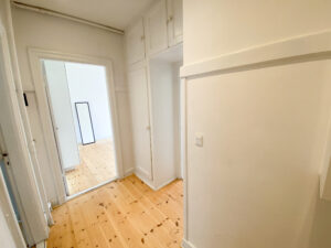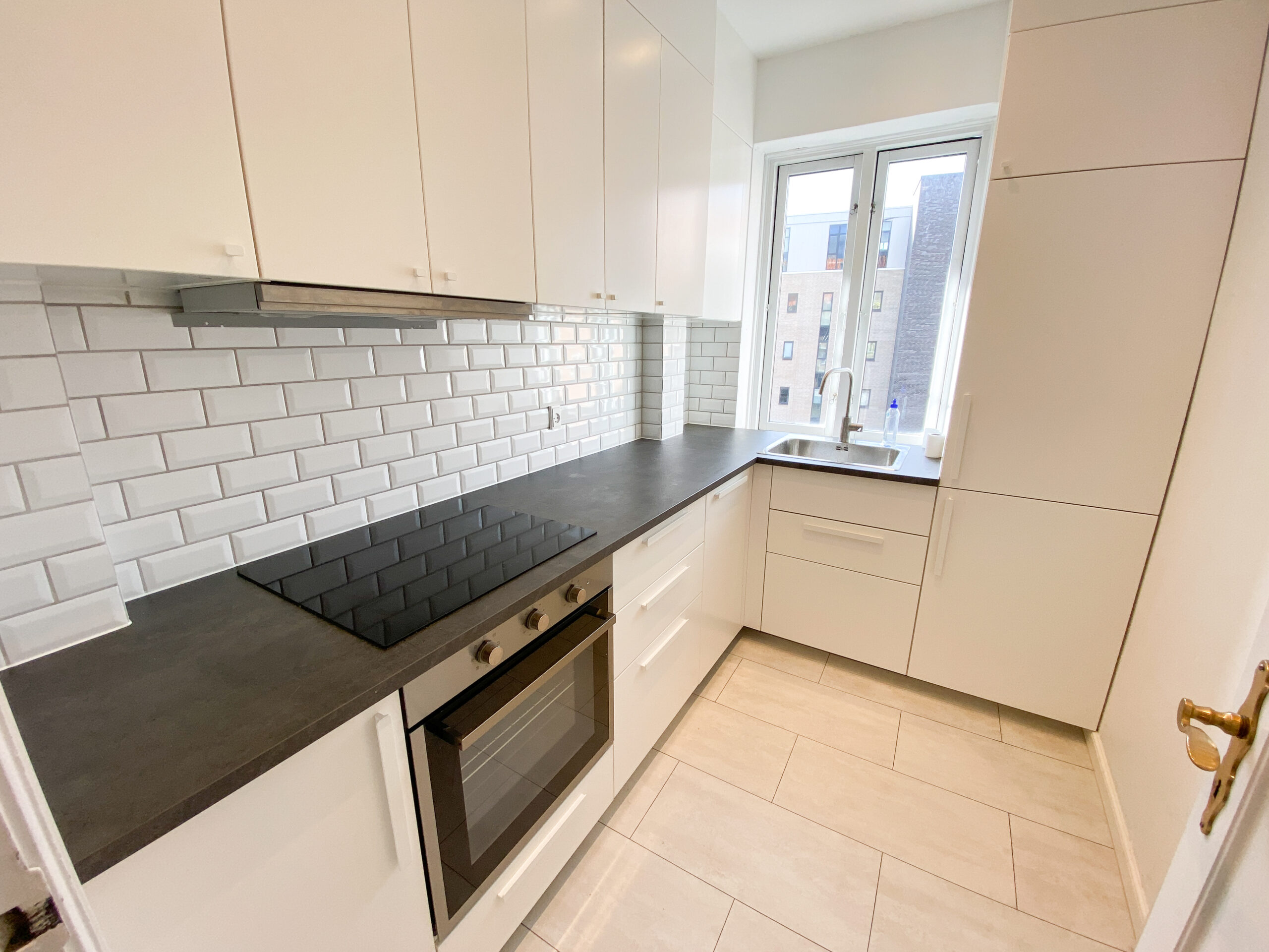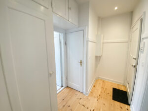 Når du træder ind, mødes du af en lille entré, der leder dig videre til tre gode rum. Til venstre finder du det moderne køkken med smukt sandfarvet flisegulv, og ved siden af ligger det renoverede badeværelse med klassiske hvide klinker.