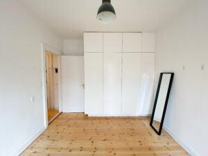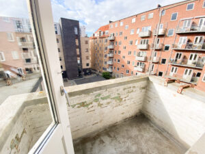 Lejligheden rummer et dejligt stort soveværelse med flotte indbyggede skabe og adgang til en vestvendt altan, hvor du kan nyde aftensolen med kig til den hyggelige gårdhave.