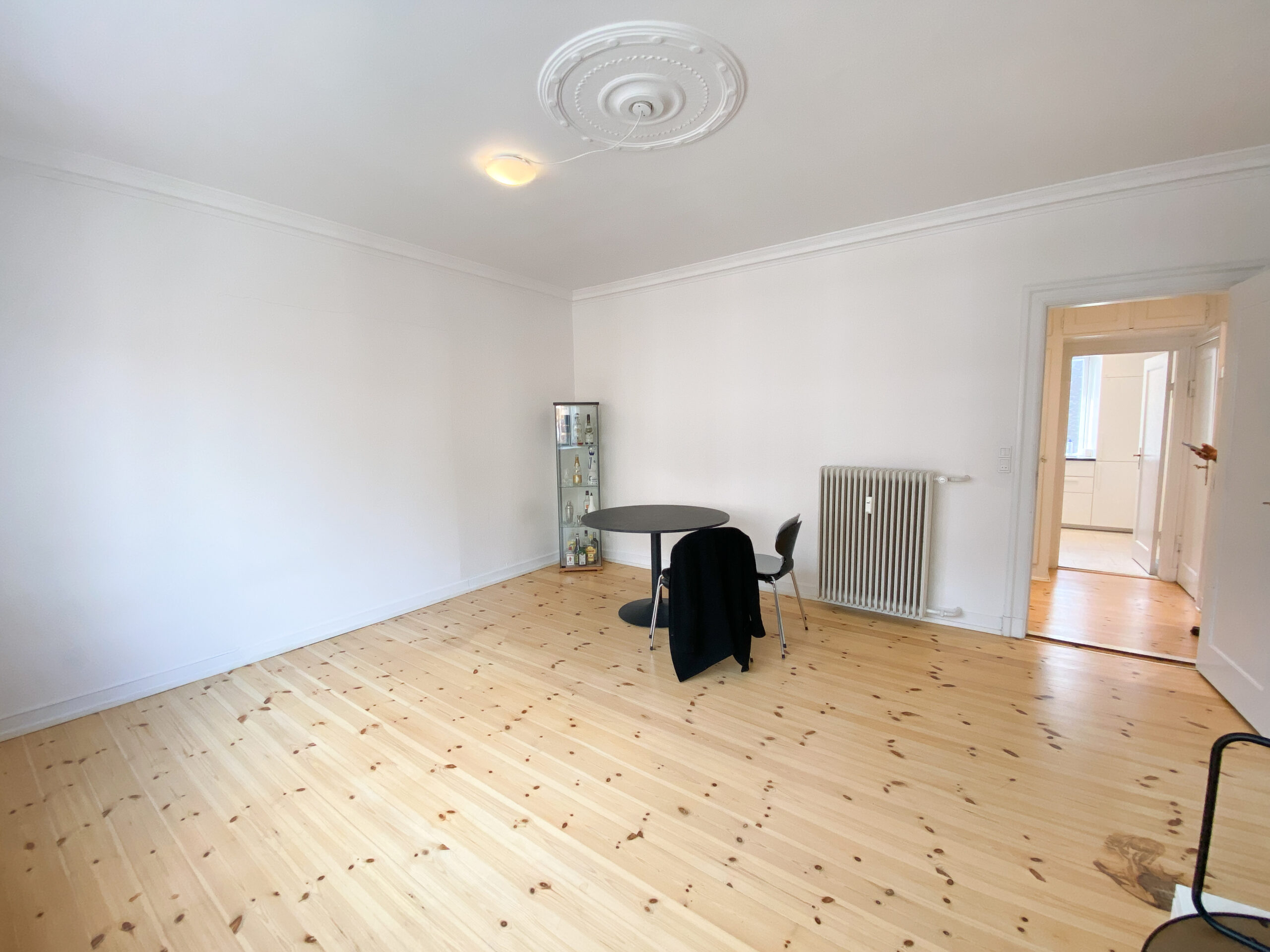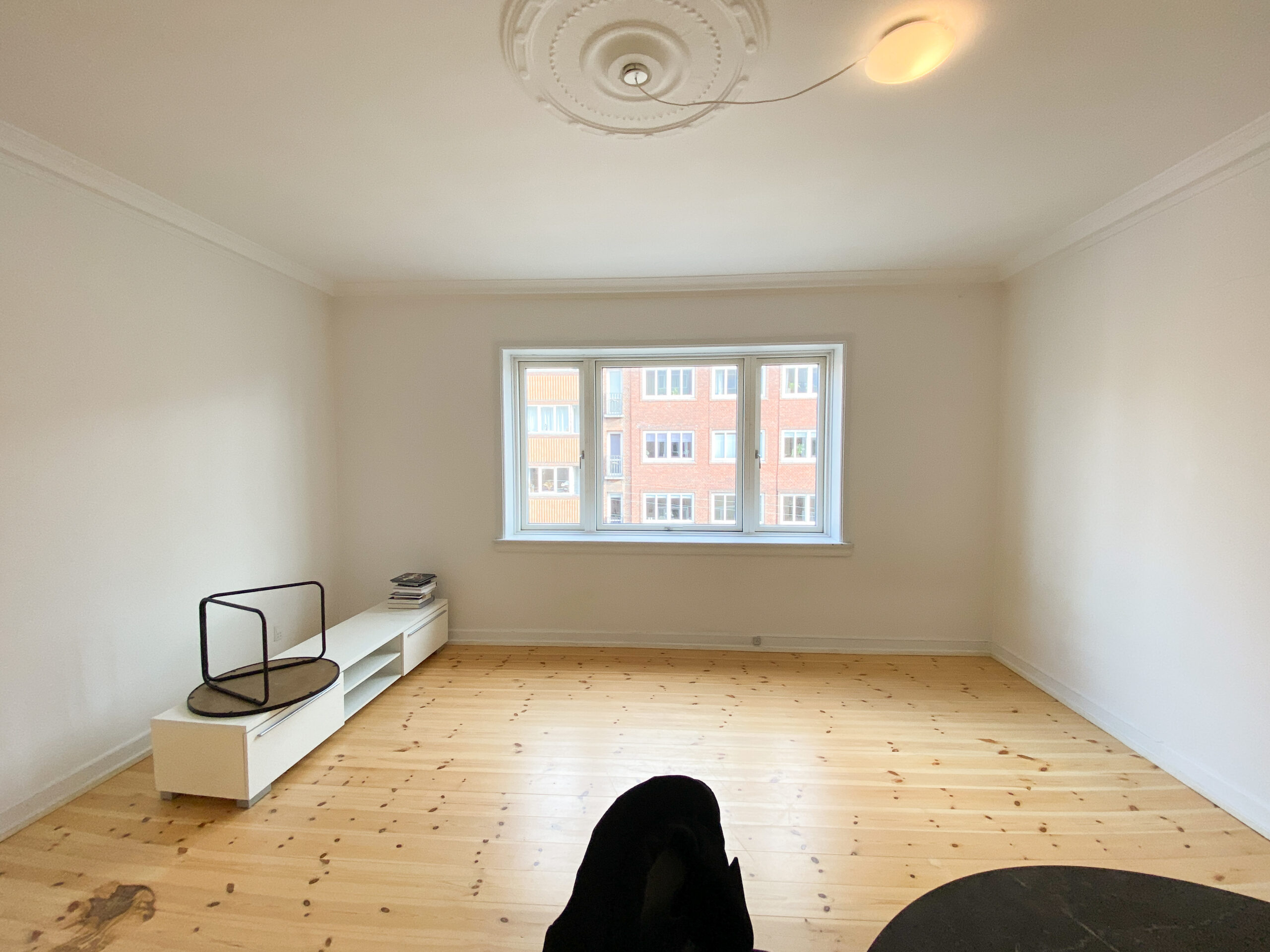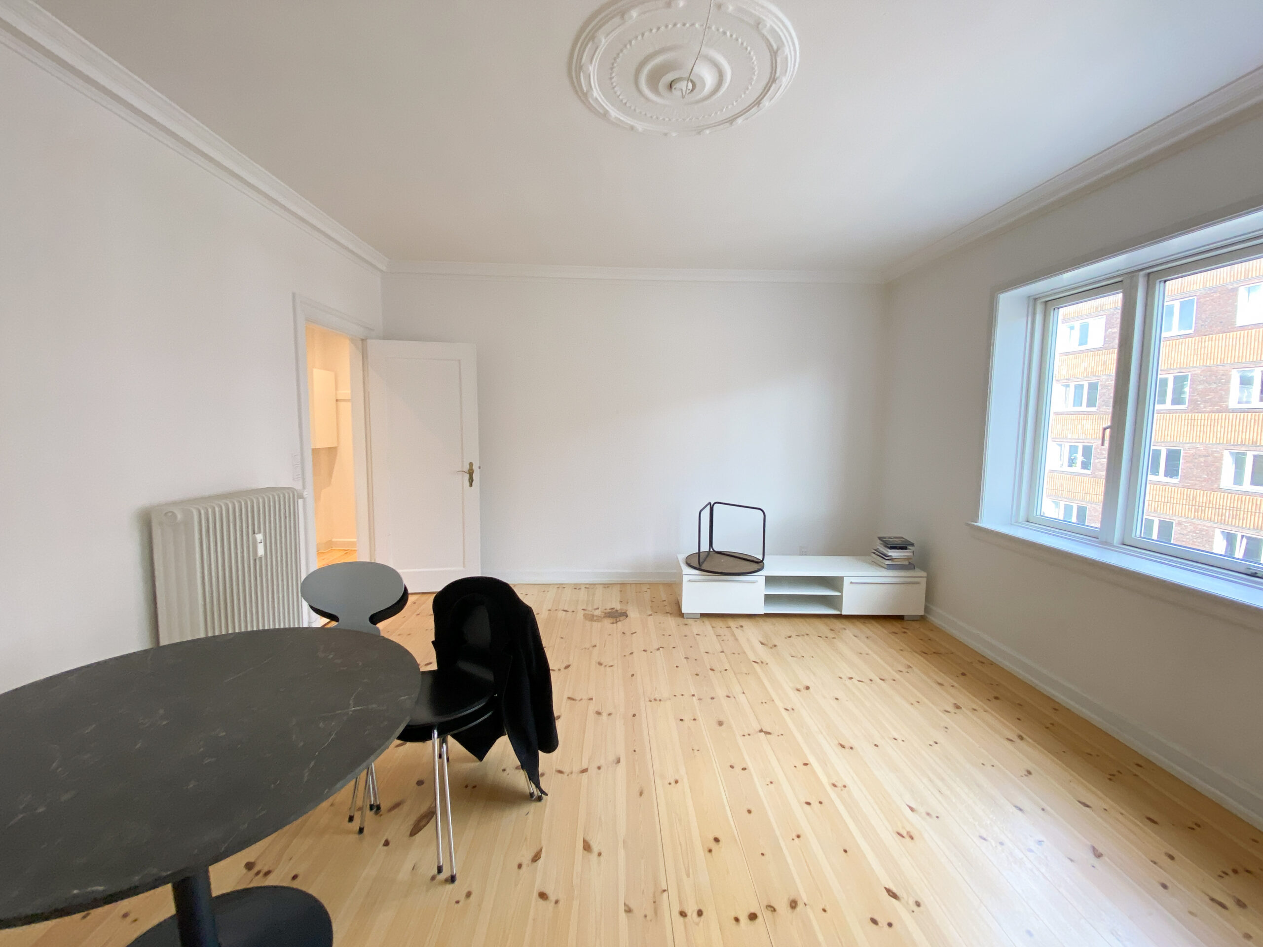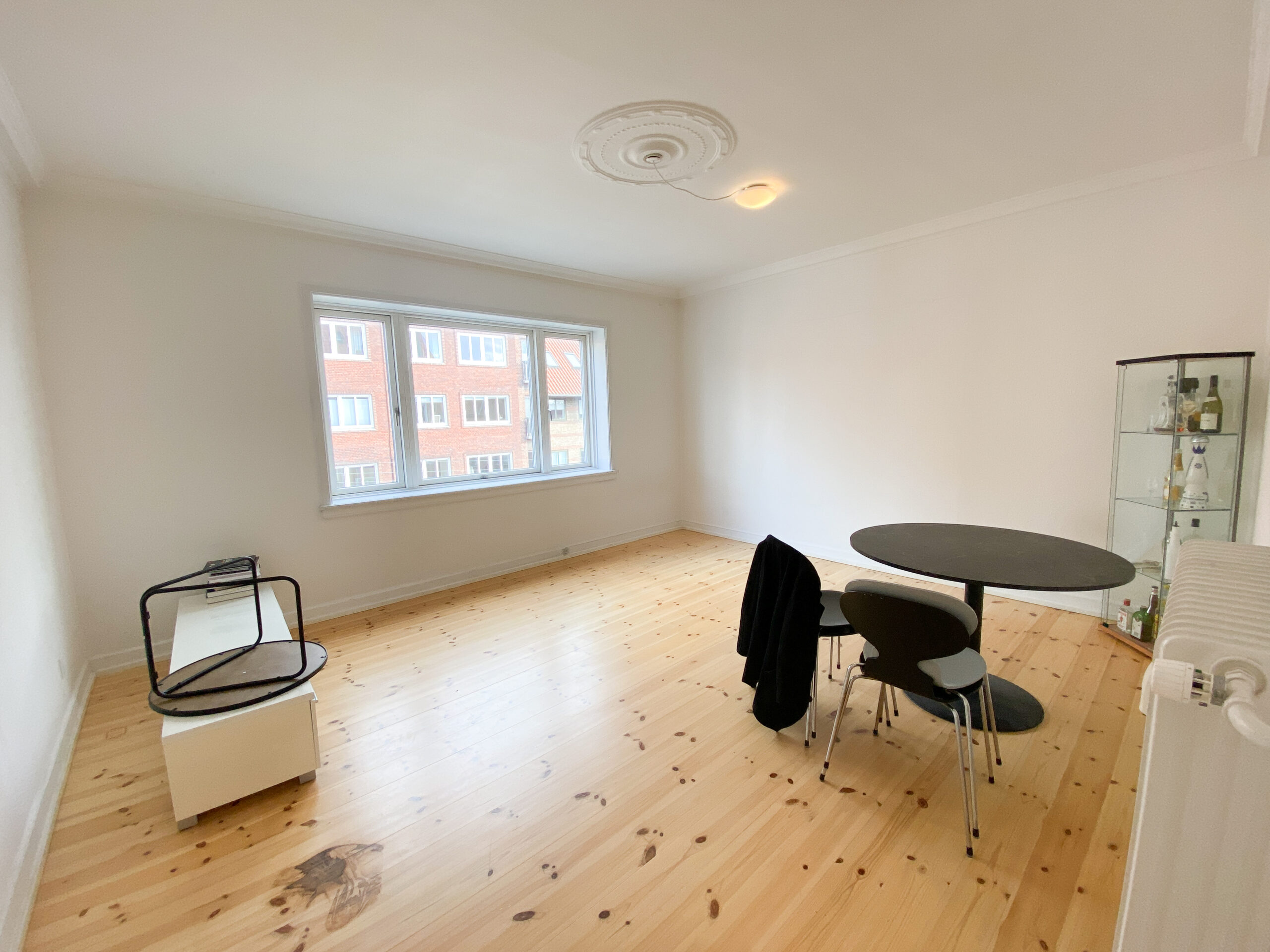 Stuen imponerer med sin gode størrelse, en elegant beige væg, stuk i loftet og et stort vinduesparti, der giver masser af naturligt lys og en charmerende udsigt over Vesterbro.