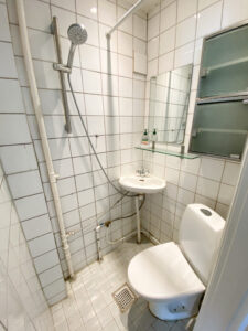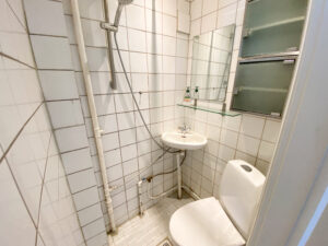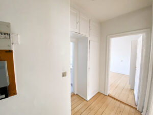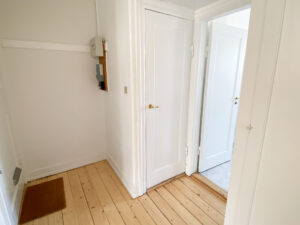 I entréen finder du praktiske indbyggede skabe med god opbevaringsplads. Herfra er der adgang til et mindre badeværelse med klassiske hvide klinker.