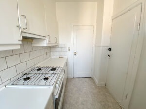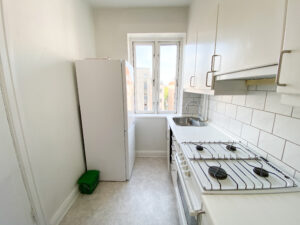Køkkenet er ligeledes holdt i hvide nuancer og byder på fin bordplads samt gode opbevaringsmuligheder.