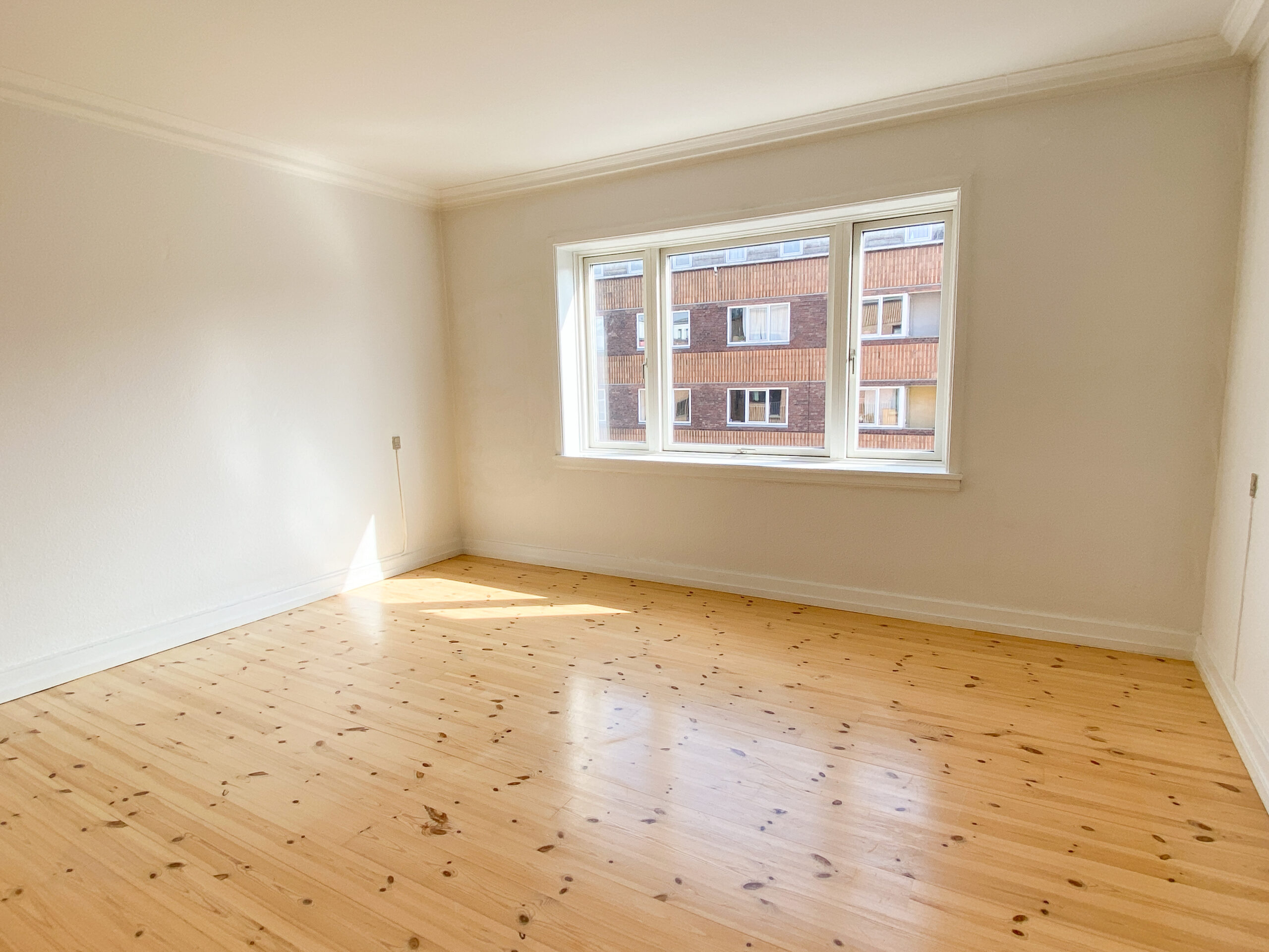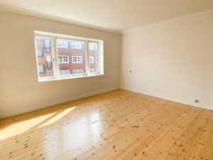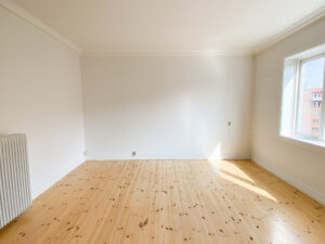 Stuen er et stort, åbent og lyst rum med et flot vinduesparti, der lader masser af dagslys strømme ind. Her er der god plads til både sofaarrangement og spiseplads, hvilket gør rummet til lejlighedens naturlige samlingspunkt.